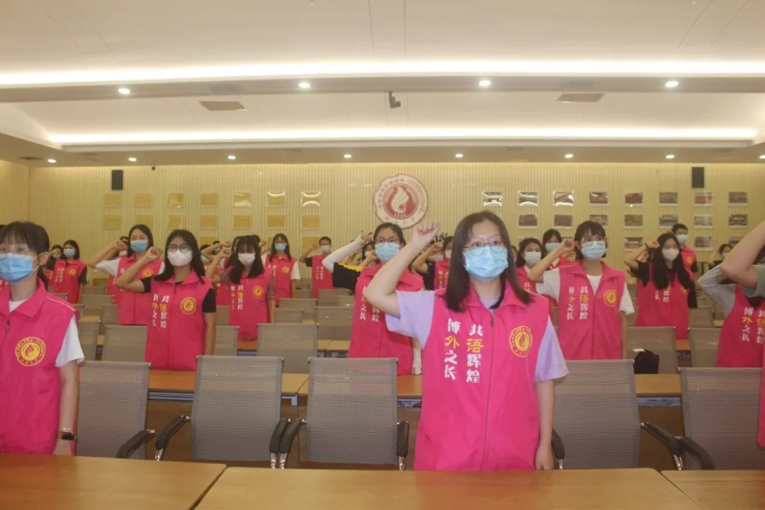 9月3日上午9点,第18届“两会”志愿者上岗仪式议程正式开始。因防控疫情需要,本次上岗仪式和岗前培训采取主会场和分会场线上直播模式进行。主会场由广西大学外国语学院团委陈星宇老师带队,我院罗漫粤等5名志愿者代表参加位于共青团广西区委的主会场会议,另外,广西大学分会场的东盟志愿者也严格按照疫情防控要求集体观看了上岗仪式和岗前培训的直播课程。