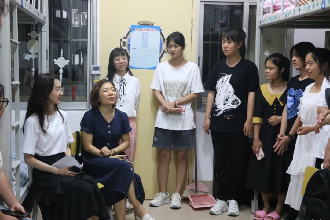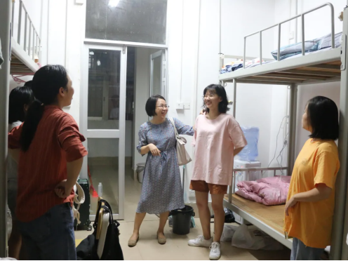 秦川老师和欧阳舟老师一同前往英语班的女生宿舍探望新生。他们发现,大部分新同学都已经收拾并安顿好了,宿舍内务也较整齐。在进行自我介绍时,新生们从开始的腼腆逐渐放松下来,谈笑自如。同学们对老师们热情有礼,老师们则询问了同学们近期的生活学习情况和将来的目标与理想,表达了学院对新生们无微不至的关心。