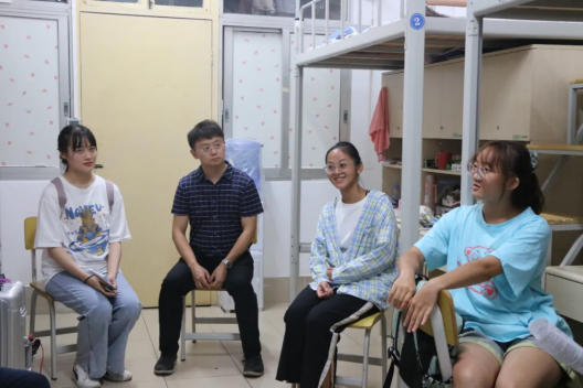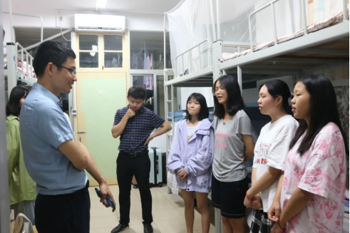 初来乍到,温暖尤至。9月5日晚上19点30分,外国语学院党委副书记肖克宁老师,学工组陈星宇老师、欧阳舟老师等,以及新生班主任——英文系的秦川老师、日语系的蔡艳艳老师和东南亚语系的卢锦缨老师,在五位大一班级班助们的陪同下,前往西12栋和西15栋的新生宿舍,看望和慰问外国语学院2021级本科新生。
