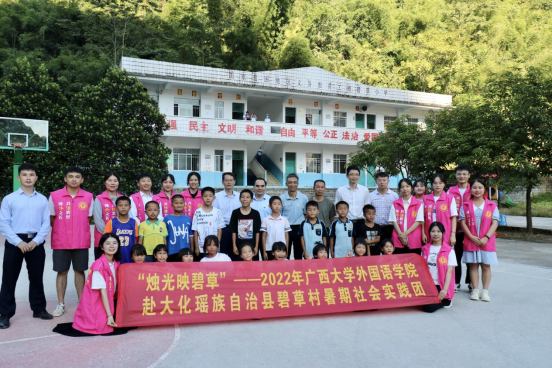 广西大学外国语学院2022年赴大化瑶族自治县碧草村暑期社会实践活动圆满结束。此次暑期社会实践活动时间虽短,但意义深远。全体实践团成员将所学深耕基层,以实践服务社会;也在实践中拓宽视野、增长才干,在实践中传承红色精神,贡献青春力量。以知行合一的方式,喜迎二十大,永远跟党走,奋进新征程。