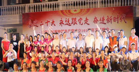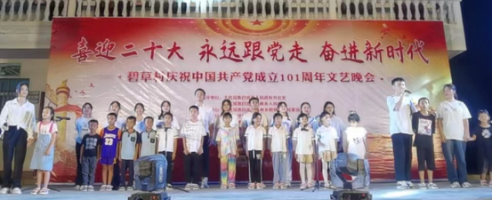 2022年7月13日晚上,为庆祝中国共产党成立101周年,进一步推进碧草村精神文明建设,丰富广大村民的精神文化生活,广西大学外国语学院、北海艺术设计学院与碧草村村民委员会联合举办“‘喜迎二十大 永远跟党走 奋进新时代’碧草村庆祝中国共产党成立101周年文艺晚会”。