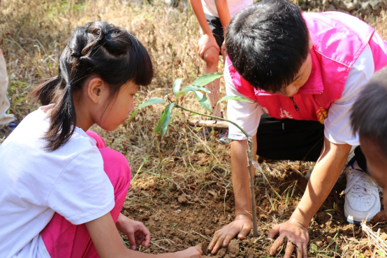 (实践团成员与碧草小学学生一起植树)