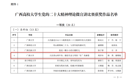 近日,由自治区党委教育工委、自治区教育厅组织开展的广西高校大学生党的二十大精神理论微宣讲比赛落下帷幕,我院研究生第三党支部党员周洋舟的参赛作品《人民青山两不负——描绘生态文明的“壮”美画卷》荣获一等奖。