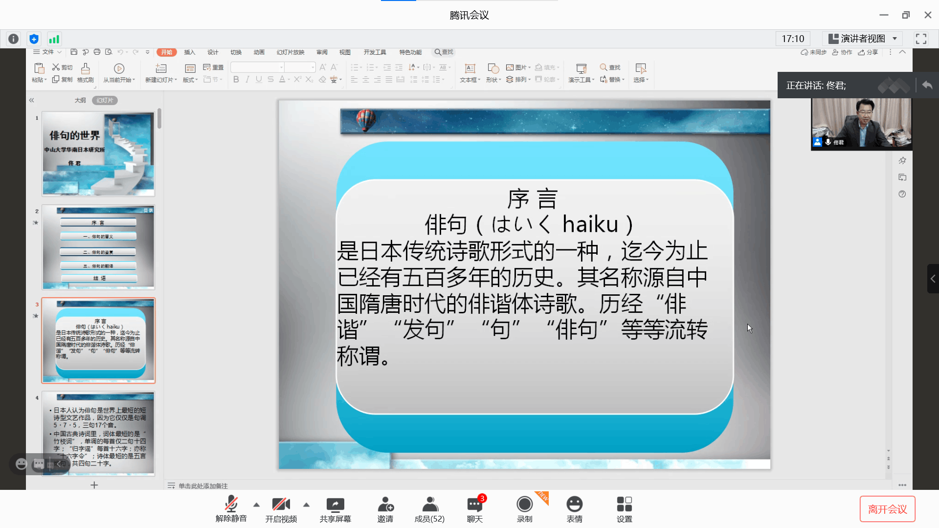 10月20日晚7点,外国语学院介子学术讲坛第三十七讲通过腾讯会议在线视频圆满举行。中山大学华南日本研究所副所长,广东省本科高校外语类专业教学指导委员会亚非语言专业分委员会副主任委员,《东亚学术研究》编委佟君教授,应我院邀请,以“俳句的世界”为题,为我院师生进行了精彩的线上讲座,带大家走进日本古典诗歌的世界。本次讲座由外国语学院张贵生博士主持。