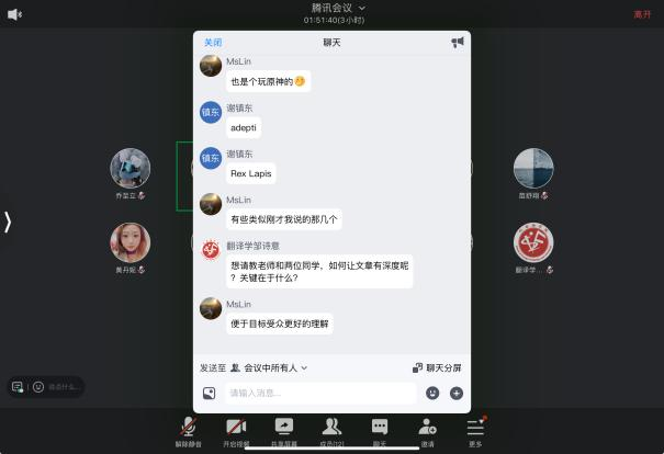 线上会议现场气氛热烈,主讲人就报告内容与参会同学进行了深入交流,并细致回答了老师与同学们所提出的问题。林老师也就文章深度这个话题给予了同学们提示和启发。
