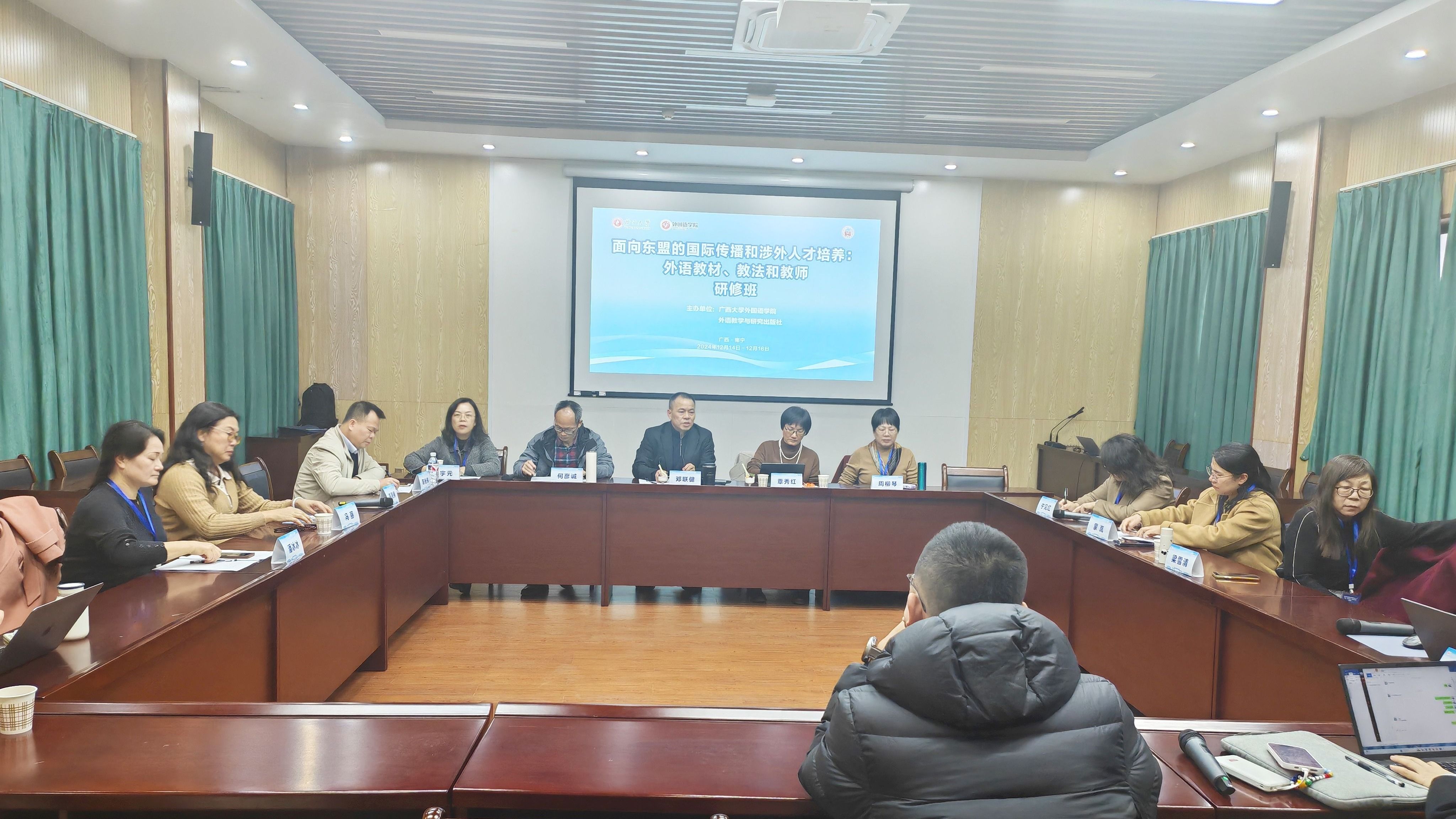 2024年12月15日,由广西大学外国语学院与外语教学与研究出版社联合主办的“面向东盟的国际传播和涉外人才培养:外语教材、教法和教师研修班”在广西大学成功举办。教育部外国语言文学类专业教学指导委员会主任委员孙有中、教育部高等学校外国语言文学类专业教学指导委员会英语专业教学指导分委员会委员常俊跃、外语教学与研究出版社国际人才发展中心总经理冯涛、广西大学校长助理赵双良、广西大学教务处处长耿葵花出席开幕式。广西二十多所高校外语学院负责人和骨干教师七十余人参加研修班。