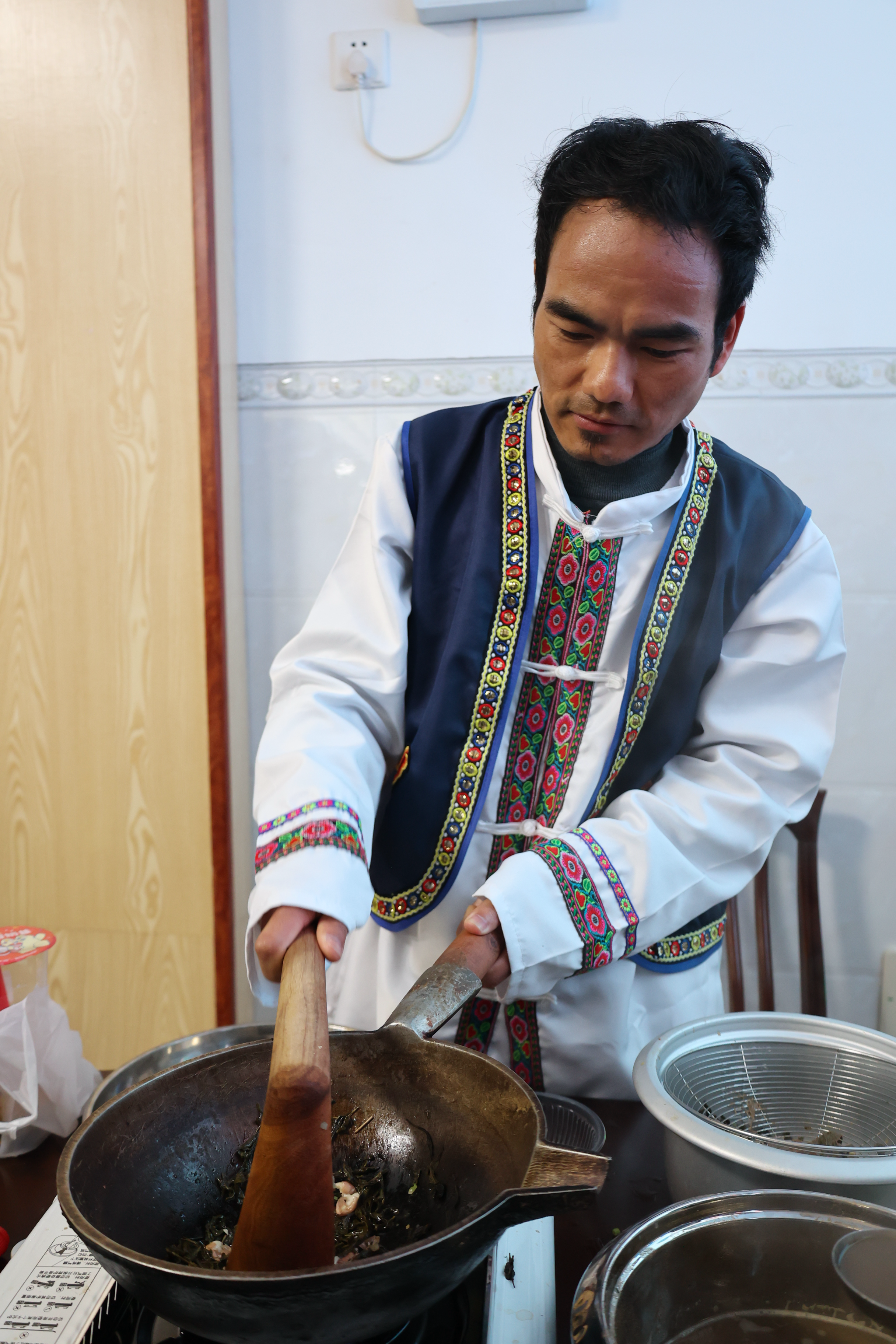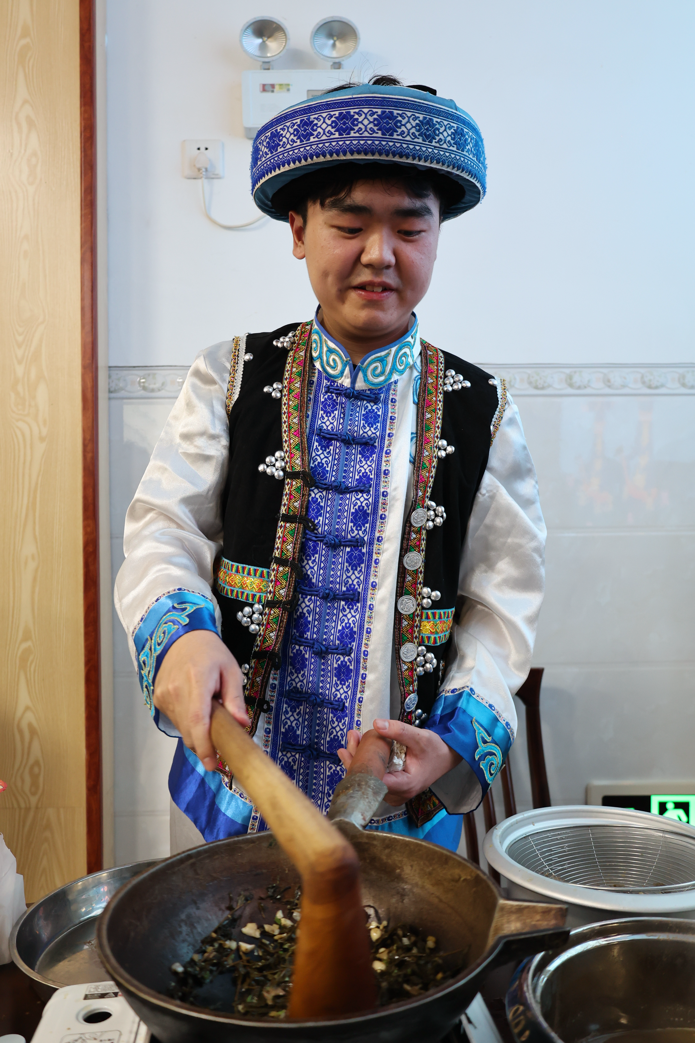 来自印度的留学生明伟同学不仅换上了壮族服饰,还主动请缨,体验了油茶的制作过程。他表示很开心能亲身参与油茶的制作,还对油茶的味道赞不绝口。明伟同学同样表达了对中国民族服饰的喜爱,认为它“很有个性”,并且期盼将来在广西大学有更多机会参加体验中国民俗的活动。