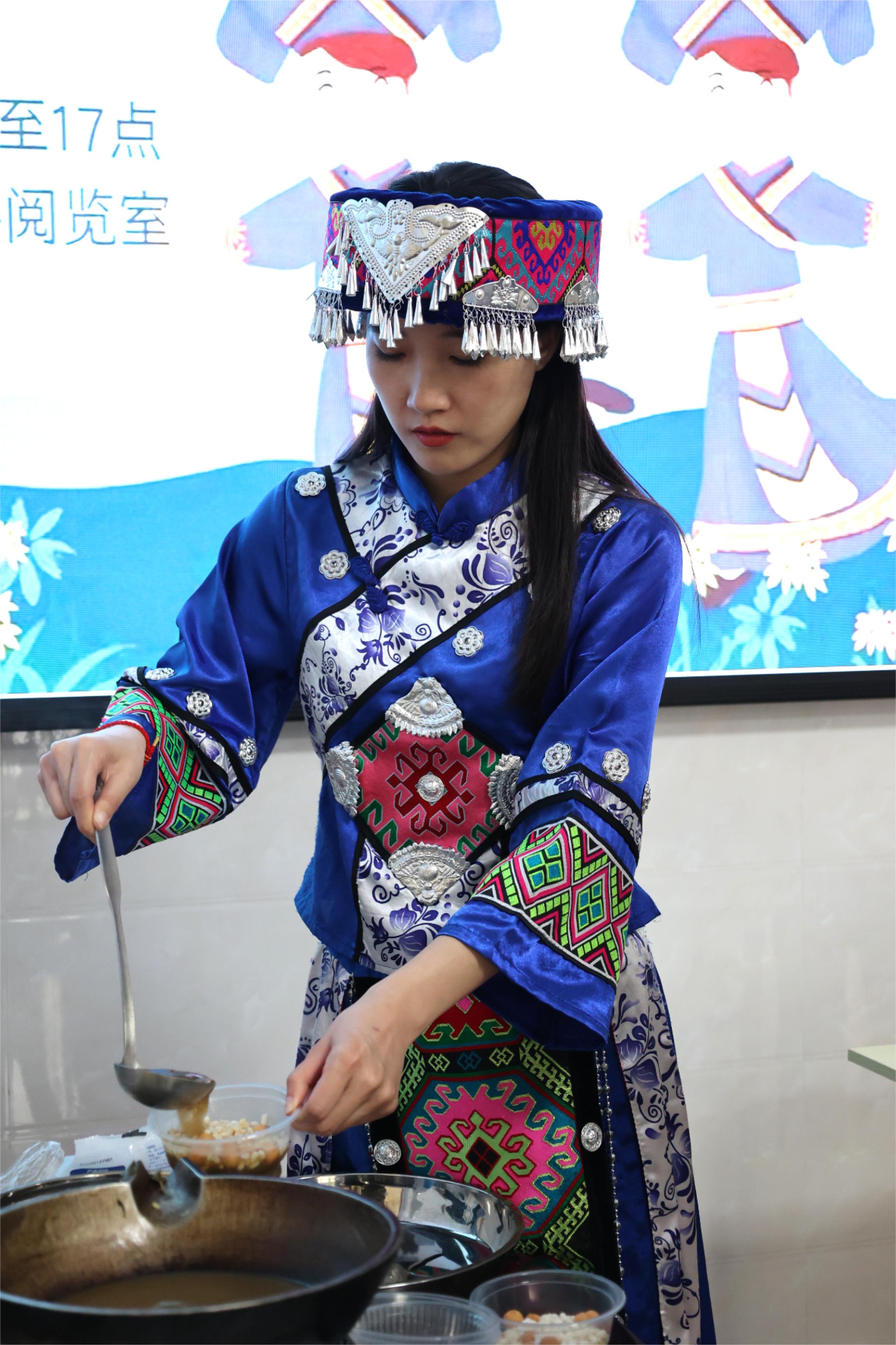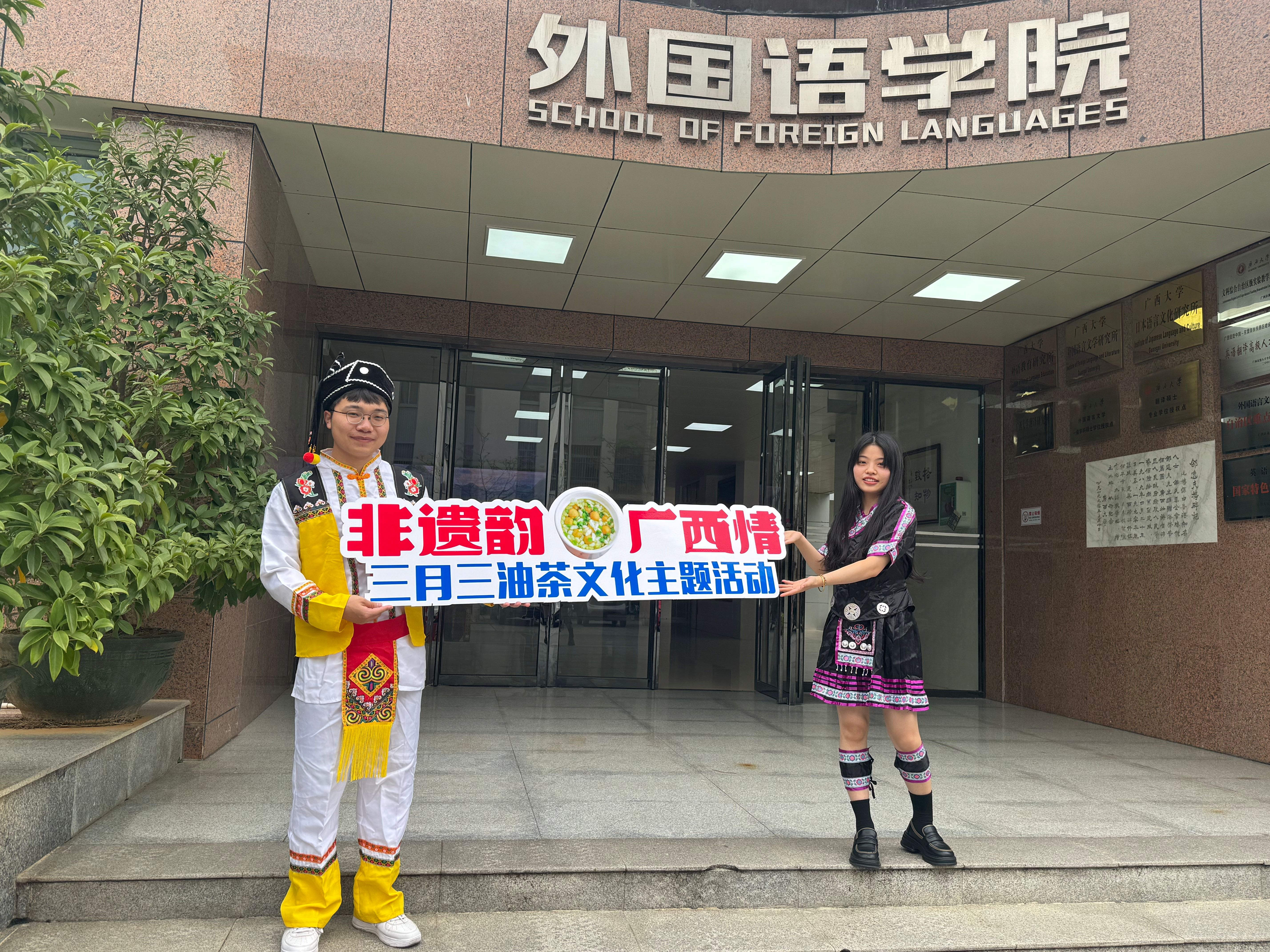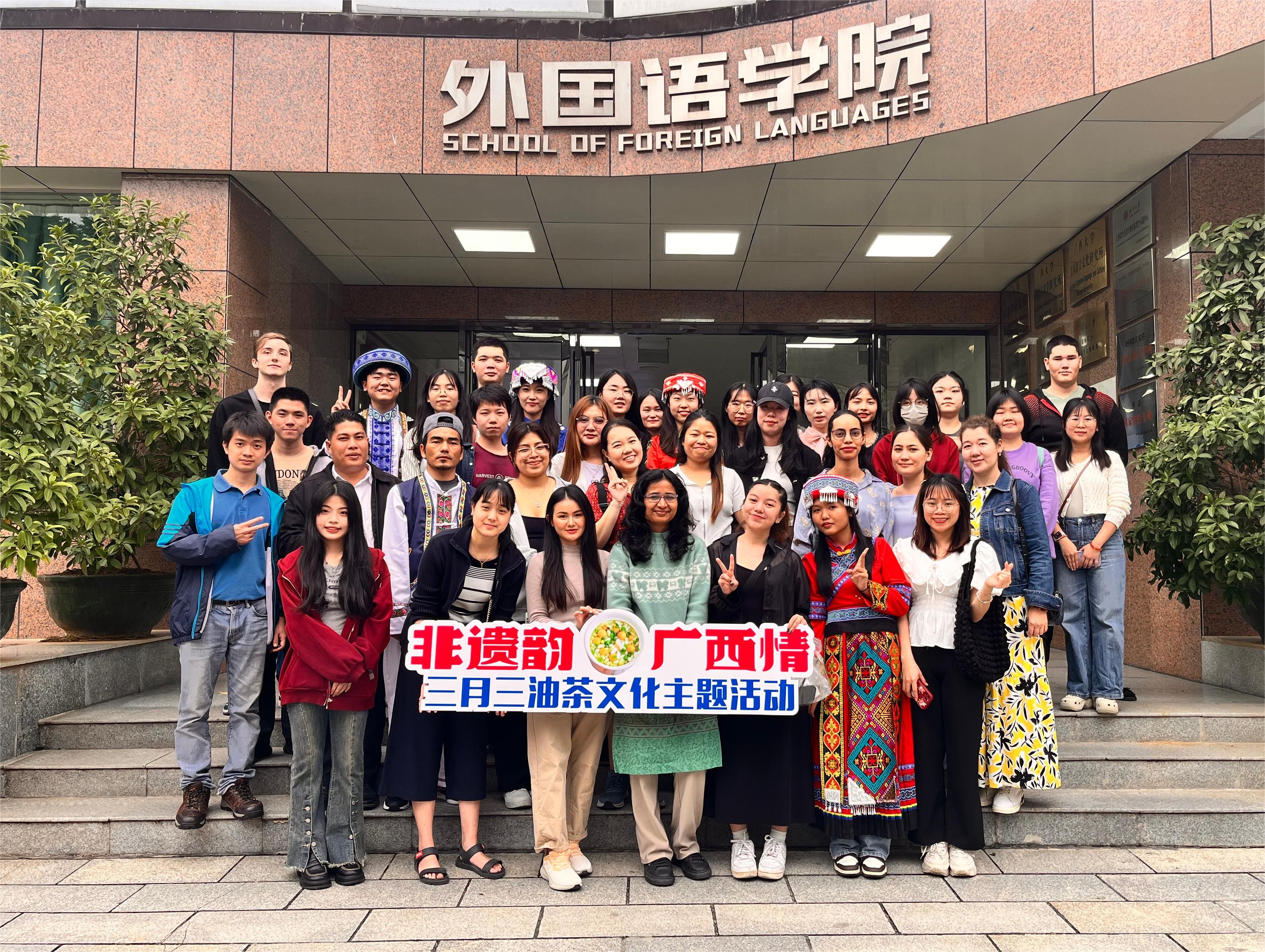 为了认真贯彻习近平总书记重要讲话,在“广西三月三”来临之际,我院研究生会于4月9日下午在广西大学外国语学院一楼阅览室举办了“非遗韵 广西情”三月三油茶文化主题活动,并邀请到来自缅甸、摩洛哥等12个不同国家的20位留学生。活动以广西恭城油茶为媒,少数民族服饰为介,众多师生与外国友人欢聚于此,同贺民族节日,一派其乐融融景象。