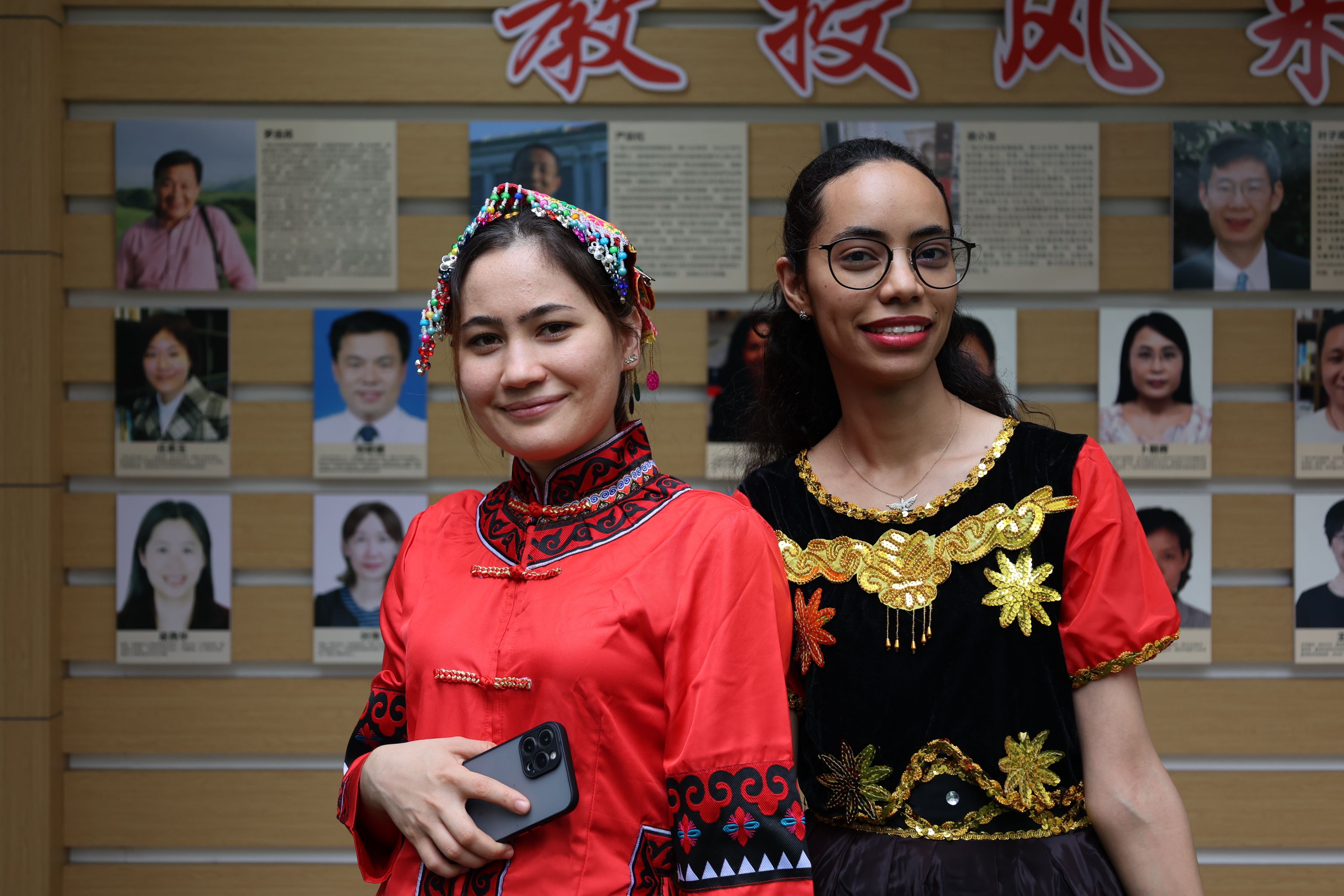 中国的少数民族文化中不仅有令人食指大动的美食,更有别具一格的靓丽服饰。本次活动,还准备了独具民族风情的服饰,供大家体验。许多留学生被美丽的民族服饰吸引,挑选自己心怡的服装换上,展现了中西融合的别样风采。一时间,楼层一隅仿佛成了百花齐放的苗圃。
