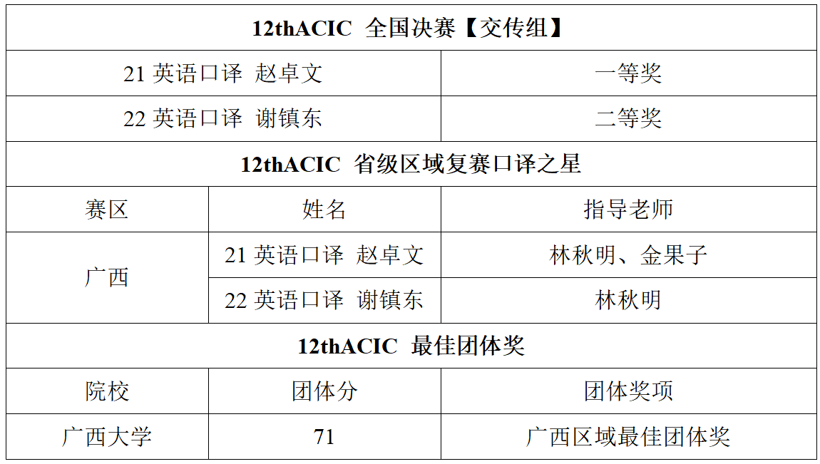 2023年12月9日—10日,第十二届全国口译大赛(英语)全国总决赛于北京语言大学举行。ACIC 全国决赛交传组分赛道上,我院学子斩获佳绩,2021级英语口译专业研究生赵卓文同学排名全国第13名,荣获交传组一等奖,创我院学子参赛以来全国排名历史新高!22英语口译谢镇东同学荣获二等奖。同时,两位同学双双取得广西赛区“口译之星”称号,广西大学荣获“广西区域最佳团体奖”。具体获奖名单如下: