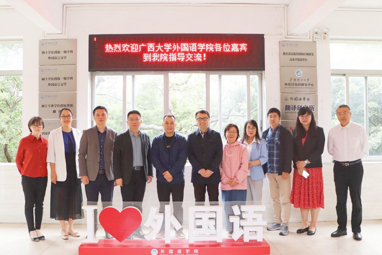11月29日上午,邓联健副院长、陈兵教授、卜朝晖教授、彭程教授、邵青博士和安文婧博士一行6人前往华南理工大学外国语学院参加调研座谈。华南理工外国语学院院长朱献珑教授、副院长徐鹰教授、日语系副主任贾海平副教授、专业研究生部主任徐阳子博士、英语系副主任车思琪老师等出席座谈会。