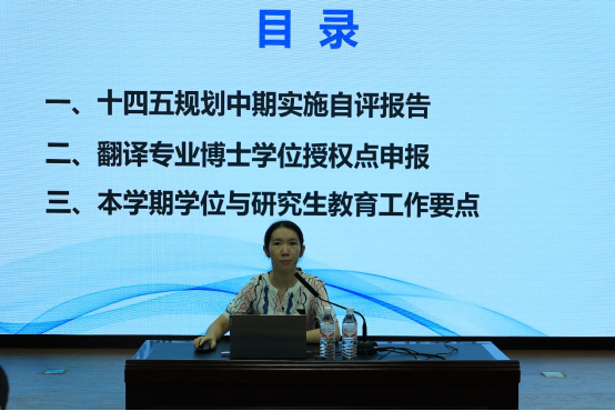 学院副院长白佳芳教授通报了学院“十四五”规划中期建设的自评的总体情况,并汇报了翻译专业博士学位授权点申报的推进情况,同时指出了本学期学位与研究生教育工作的以下要点:一是2023级硕士研究生的师生互选活动;二是研究生课程教学质量监控与提升;三是进一步完善学科群活动;四是学科与学位点建设工作;五是学位论文质量保障工作。