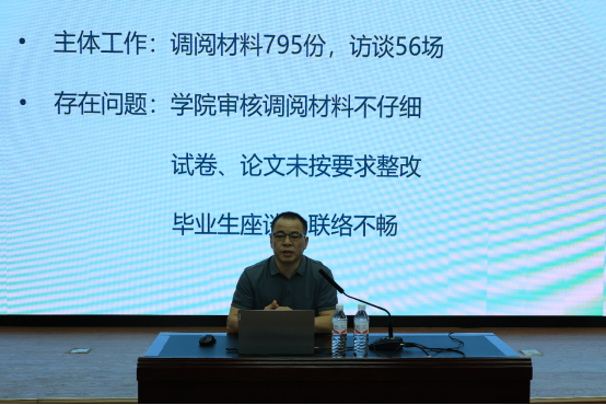 接着,教学副院长邓联健教授总结了学校上个学期的本科教育教学审核评估工作,指出了我院在上一轮评估工作存在的问题。邓教授强调本轮评估考察时间是9月24-27日,工作的目的是听课看课,解决存在的问题。他希望全体教职工认真学习评估材料,了解校情院情系情,做好访谈准备,精心备课,注意“高阶性、创新性、挑战度”,真正达到“以评促建”的目标。
