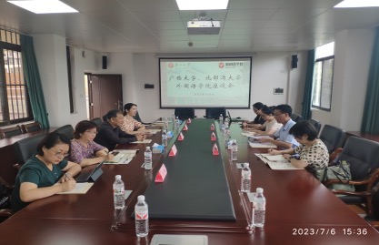 2023年7月6日下午,北部湾大学国际教育与外国语学院蔡成龙副院长、英语教研室黄伟主任、大学英语教研室刘丹副主任一行到访我院。我院院长罗选民教授、副院长白佳芳教授、翻译系主任陈兵教授、大学英语系主任曾薇副教授、MTI中心执行主任黄成湘副教授在逸夫楼301会议室与到访来宾座谈。