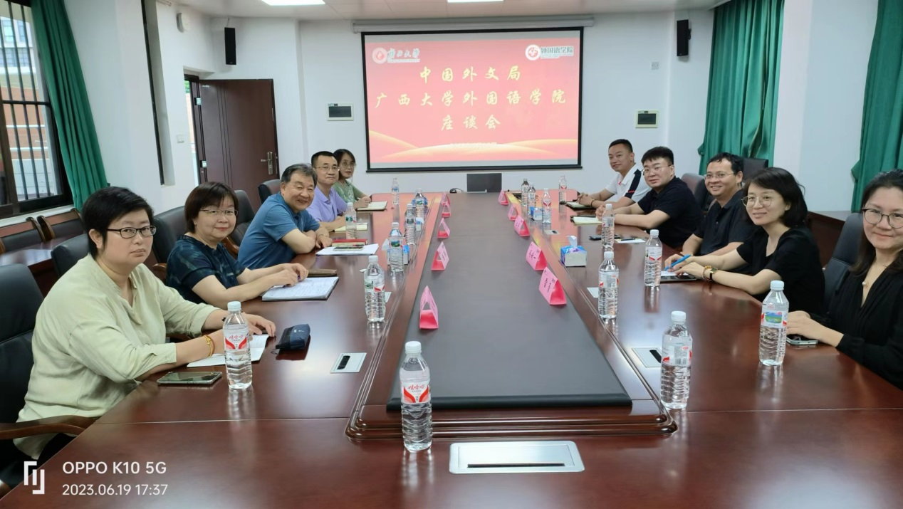 2023年6月19日下午,中国外文局全国翻译专业资格(水平)考试项目管理中心负责人江平主任,中国外文局全国翻译专业资格(水平)考试项目中心冯婧一副主任,中国外文局全国翻译专业资格(水平)考试项目中心海外考试部赵怡隆主任,CATTI国际版测试广西工作委员会黄东主任,越泰语推广负责人雷蕾主任一行五人到访我院。外国语学院院长罗选民教授、越南语系主任祁广谋教授、日语系主任卜朝晖教授、翻译系主任陈兵教授和泰语教研室主任秦璞副教授在逸夫楼301室与到访来宾座谈。