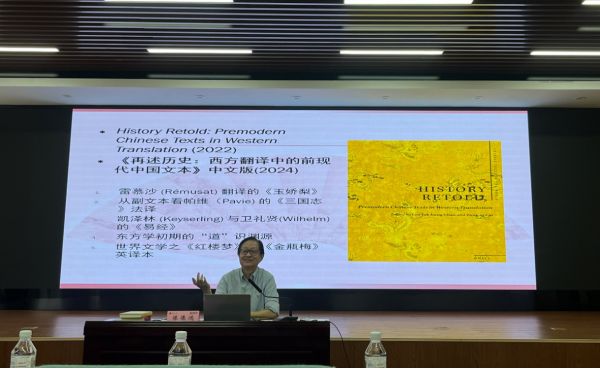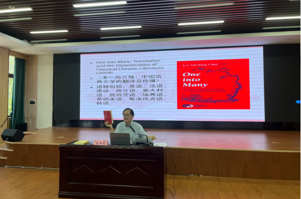 讲座伊始,教授介绍了他的两本专著:《本一殊:中国古典文学翻译传播》和《再历史:西方翻译中的前现代中国文本》,从中提出了古典文学外译理论,翻译研究中有待全面探索的,是将经典著作从一种语言翻译成多种语言的现象