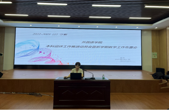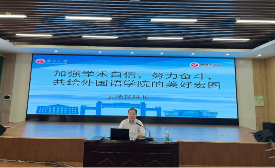 首先,罗选民院长做了题为“加强学术自信,努力奋斗,共绘外国语学院的美好宏图”的主题发言。罗院长列举了我院2022年软科排名,激励全体教职工树立学术自信,勇攀高峰,为申报博士点群策群力。同时,罗院长强调本科教育教学审核评估工作的重要性,加强学科内涵建设,以评促建。