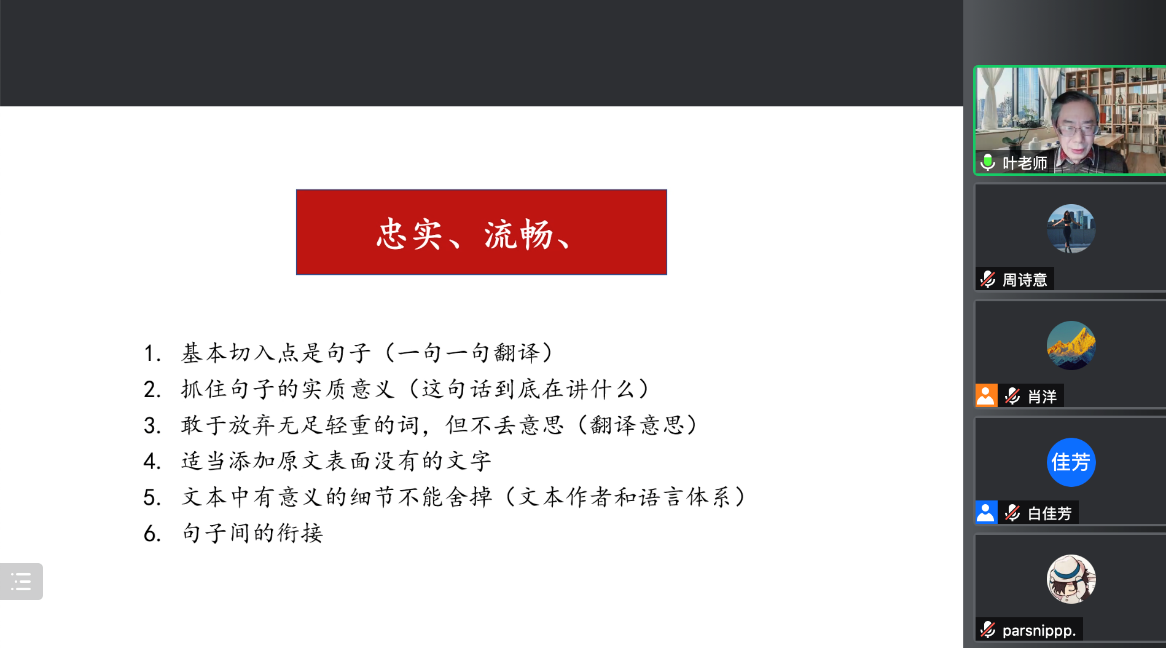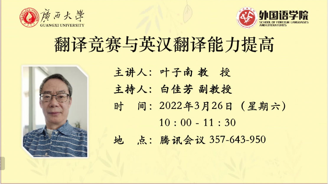 3月26日上午,广西大学外国语学院成功举行了题为“翻译竞赛与英汉翻译能力提高”的线上学术讲座。本次讲座由广西大学特聘教授叶子南教授主讲,广西大学外国语学院副院长白佳芳副教授主持,为外国语学院的众多师生带来了精彩的翻译实例解析案例和翻译策略的选择技巧,吸引了我院众多师生、特别是翻译专业的学生聆听学习。