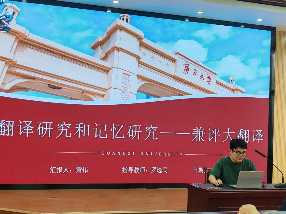 黄伟同学的学术报告题为《翻译研究和记忆研究——兼评大翻译》。在报告中,黄伟同学聚焦“大翻译”理论,梳理文化记忆的发展,探讨其在翻译研究中的应用,并详细介绍了“大翻译”中的核心概念,指出“大翻译”的跨学科性、互文性等特点。黄伟同学的报告深入浅出地阐述了翻译研究与记忆研究的内在关联,并基于对“大翻译”理论的理解和思考提出该理论未来在应用层面的研究方向。