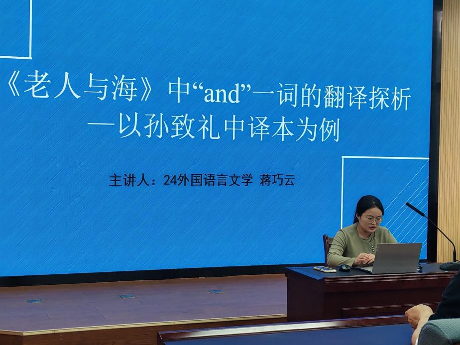蒋巧云同学以《<老人与海>中“and”一词的翻译探析——以孙致礼中译本为例》为题,分享了自己的选题来源、研究方法及研究过程。在研究中,蒋巧云同学通过词频统计、案例分析等方式,探析“and”这一小词在孙致礼译本中的翻译,得出“and”在连接句子被译出时,往往能够对塑造人物形象、推动故事情节等有着积极的意义。蒋巧云同学的报告内容丰富、研究工作扎实,在讲解过程中逻辑清晰,其研究是“小题大做”的典范,为同学们提供了学术写作新思路。