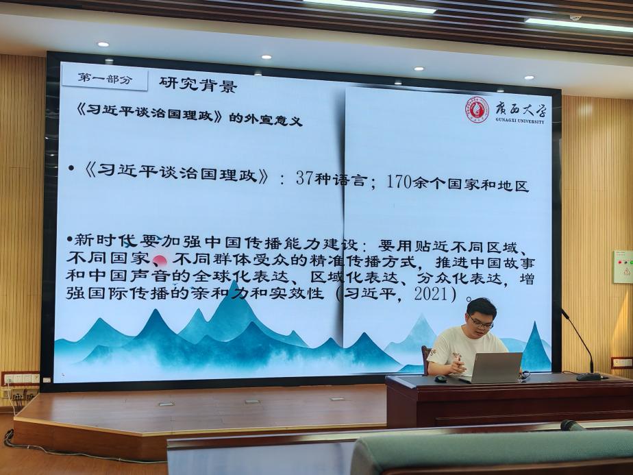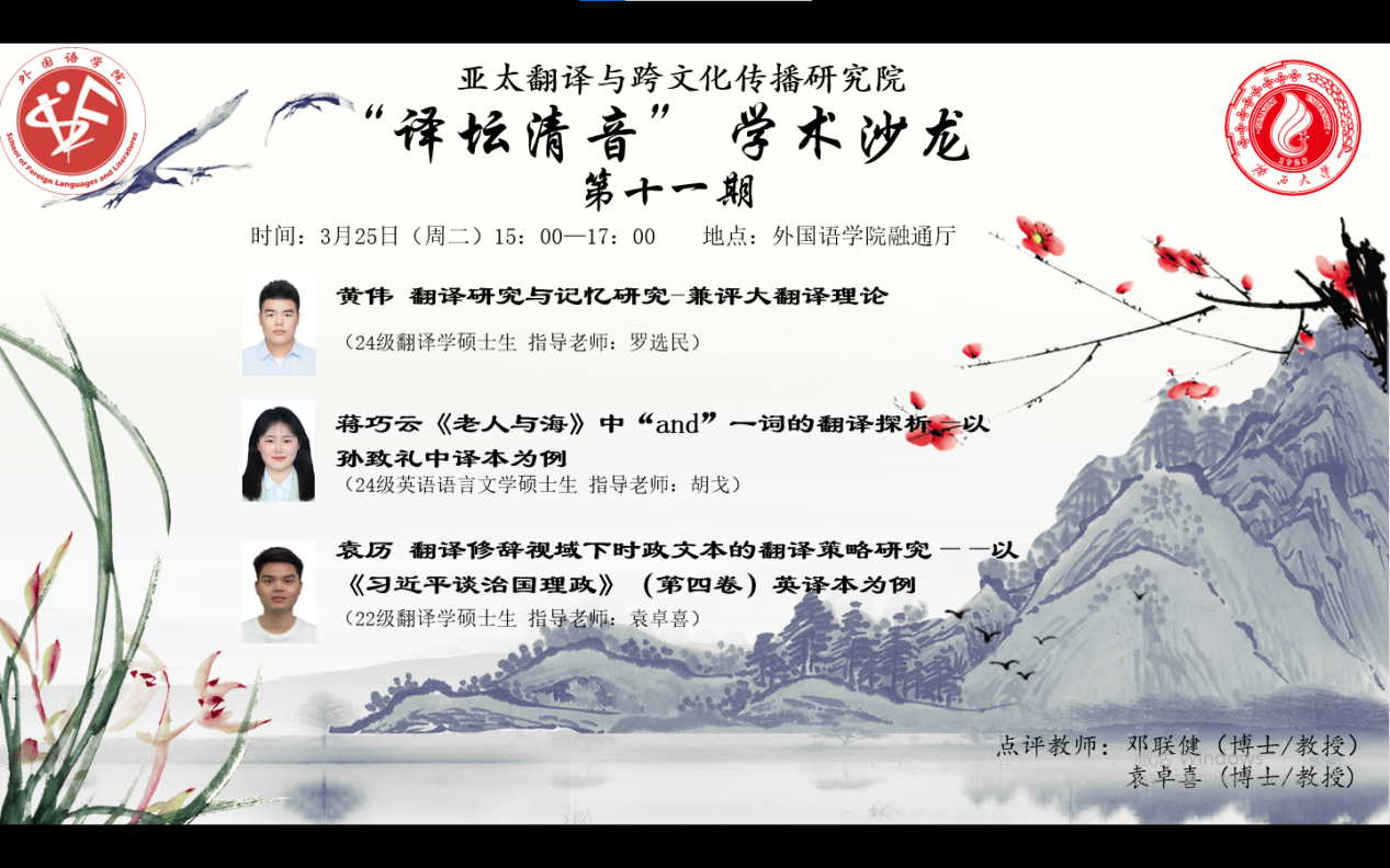 2025年3月25日,广西大学外国语学院翻译学学科群在学院融通厅成功举办第十一期“译坛清音”学术沙龙活动。本期沙龙活动由我院24级翻译学研究生王奇同学和谢媛同学策划主持,主讲人为22级翻译学袁历同学、24级翻译学黄伟同学和24级英语语言文学蒋巧云同学,邓联健教授和袁卓喜教授作为点评专家出席本次学术活动。