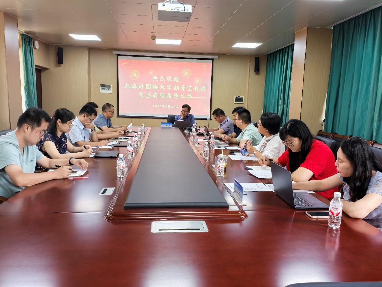 8月21日下午,上海外国语大学校长助理、语言科学研究院院长胡开宝教授莅临我院指导工作,学院院长邓联健、学院党委书记莫柏林、副院长彭程、院长助理曾薇、英文系主任李晓滢、翻译系主任安文婧、日语系刘君博士,以及中国—东盟研究院副院长,马来西亚研究所与文莱研究所负责人罗传钰、越南研究所骨干教师朱成林、缅甸研究所骨干教师杨飞、计算机学院覃希老师等参加座谈交流。
