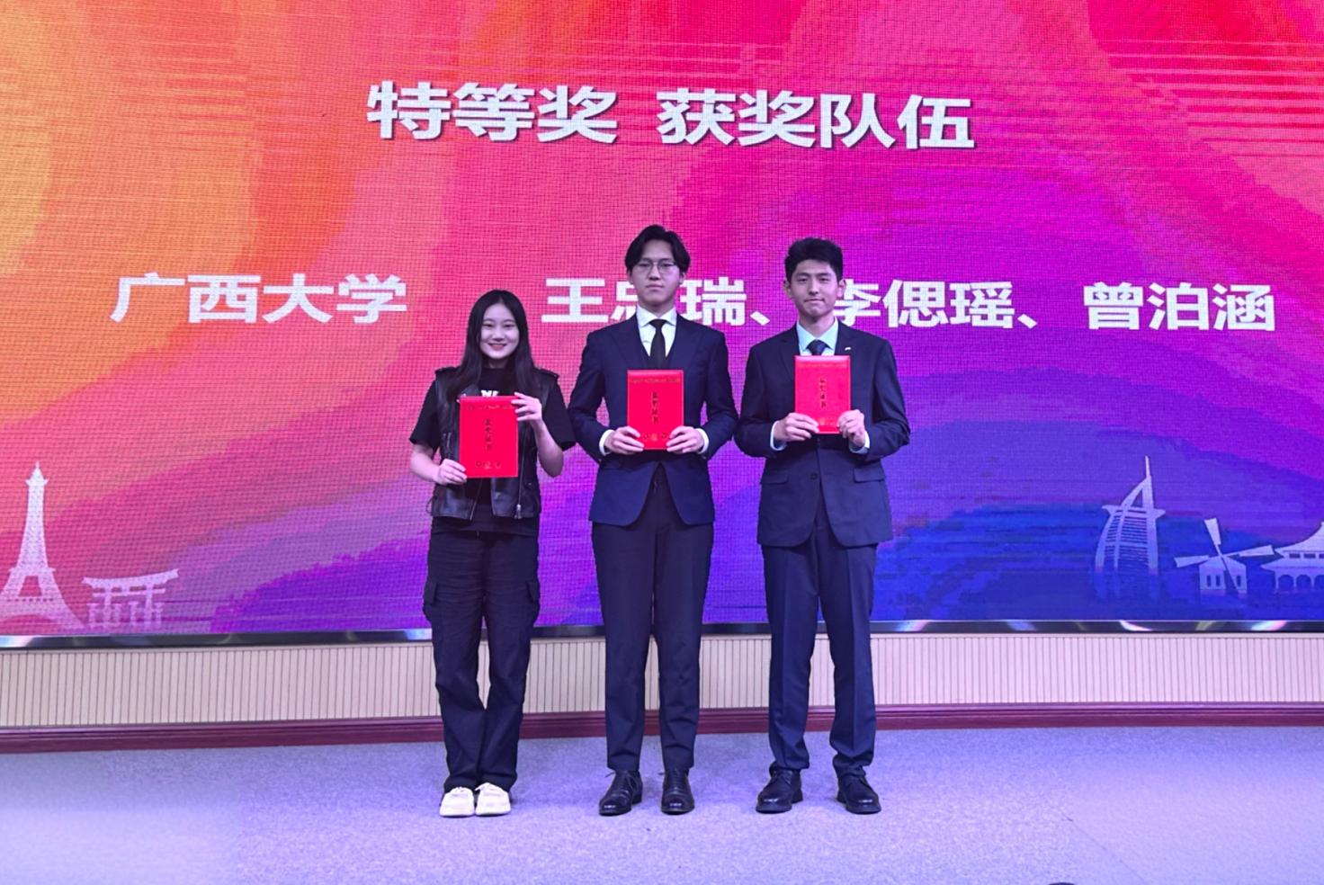 11月22日,第八届“外教社杯”全国高校学生跨文化能力大赛广西赛区比赛收官。作为经教育部认证的外语类三大A类赛事之一,该赛事代表了国内跨文化研究与实践领域的最高水平。本次区赛共有南宁师范大学,广西中医药大学,桂林理工大学等10支队伍参赛,每支队伍3人。广西大学代表队由法学院法学专业王忠瑞、外国语学院越南语专业李偲瑶、化学化工学院化学工程与工艺专业曾泊涵等3位同学组成。在外国语学院教师杨颖、韦月丽的精心指导下,从初赛、复赛到决赛,他们一路保持领先优势,每赛段均以第一名成绩晋级,最终荣获区级决赛唯一特等奖,并成功晋级全国总决赛。
