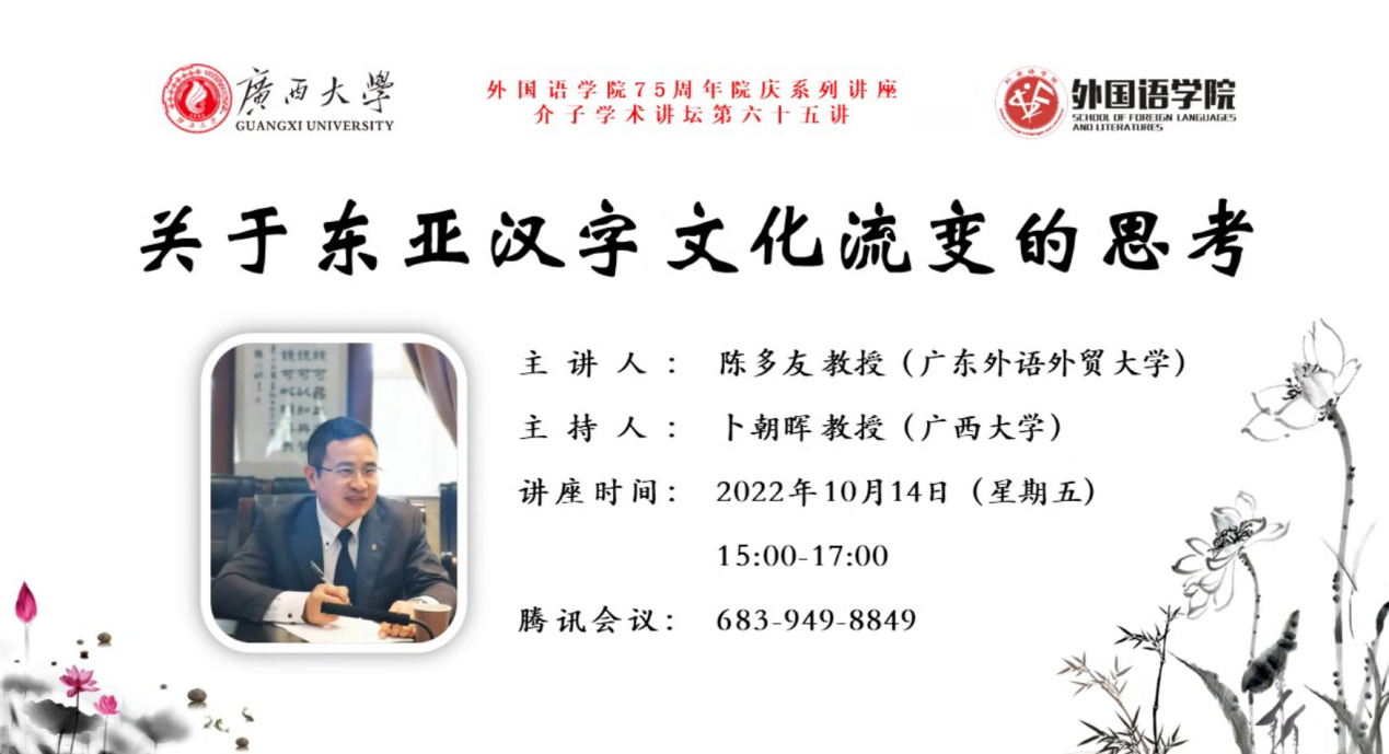 2022年10月14日下午,广西大学外国语学院介子学术讲坛第六十五讲以腾讯会议的线上方式成功举行。本次讲座也是学院75周年院庆系列讲座的一部分,由广东外语外贸大学陈多友教授为外院师生带来“关于东亚汉字文化流变的思考”的主题讲座。讲座由我院日语系主任卜朝晖教授主持,吸引了众多师生前来聆听。