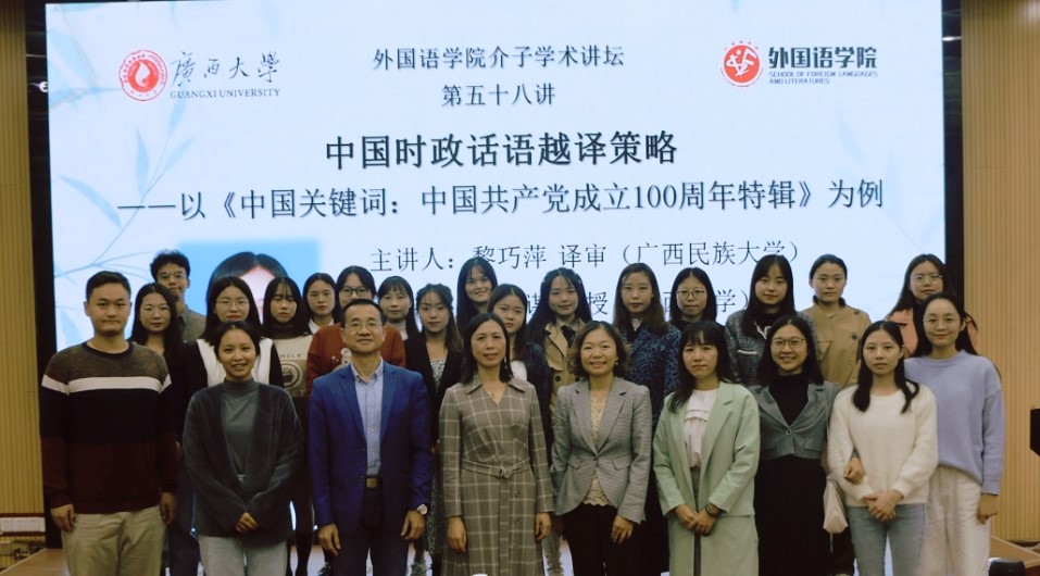 11月9日下午,外国语学院介子学术讲坛第五十八讲于广西大学外国语学院215报告厅顺利举行。广西民族大学黎巧萍译审主讲,为外国语学院师生带来题为“中国时政话语越译策略——以《中国关键词:中国共产党成立100周年特辑》为例”的精彩讲座,讲座由我院东南亚语系主任祁广谋教授主持,吸引了众多师生前来听会。