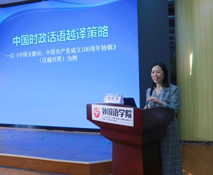 讲座伊始,黎老师提到今年正值中国共产党成立一百周年,因此选《中国关键词:中国共产党成立100周年特辑》这个主题和全体师生一起探讨。首先,黎老师强调了新时代翻译的意义,并解释什么是时政话语。接着黎老师以理论与实践相结合的方式讲解时政话语越译策略,并提出五个要求:即在翻译的过程中忠实于原文核心思想内涵;确保信息完整准确;语言表达符合译入语规范和习惯;按照越语结构调整行文安排;确切表达成语典故在文献中的实际含义。黎老师提醒大家,时政话语越译,既要注意汉越语语言表达、语言结构的不同,又要注意文化的差异。最后她还强调,我们在翻译时,可以借助网络、自媒体等平台,参考越南方面关于我国时政话语的译法,还要要符合中国国情,保留鲜明的中国特色。