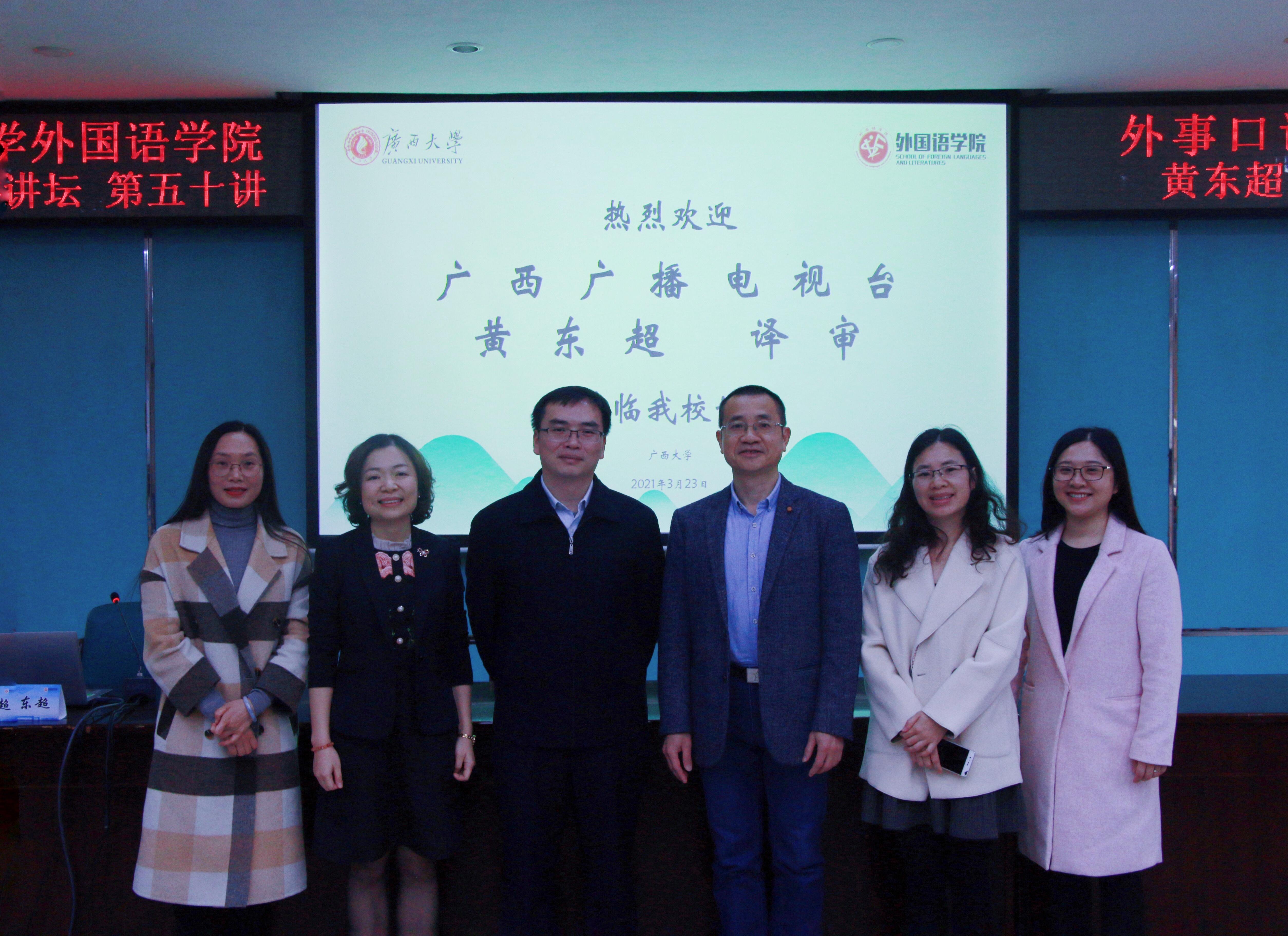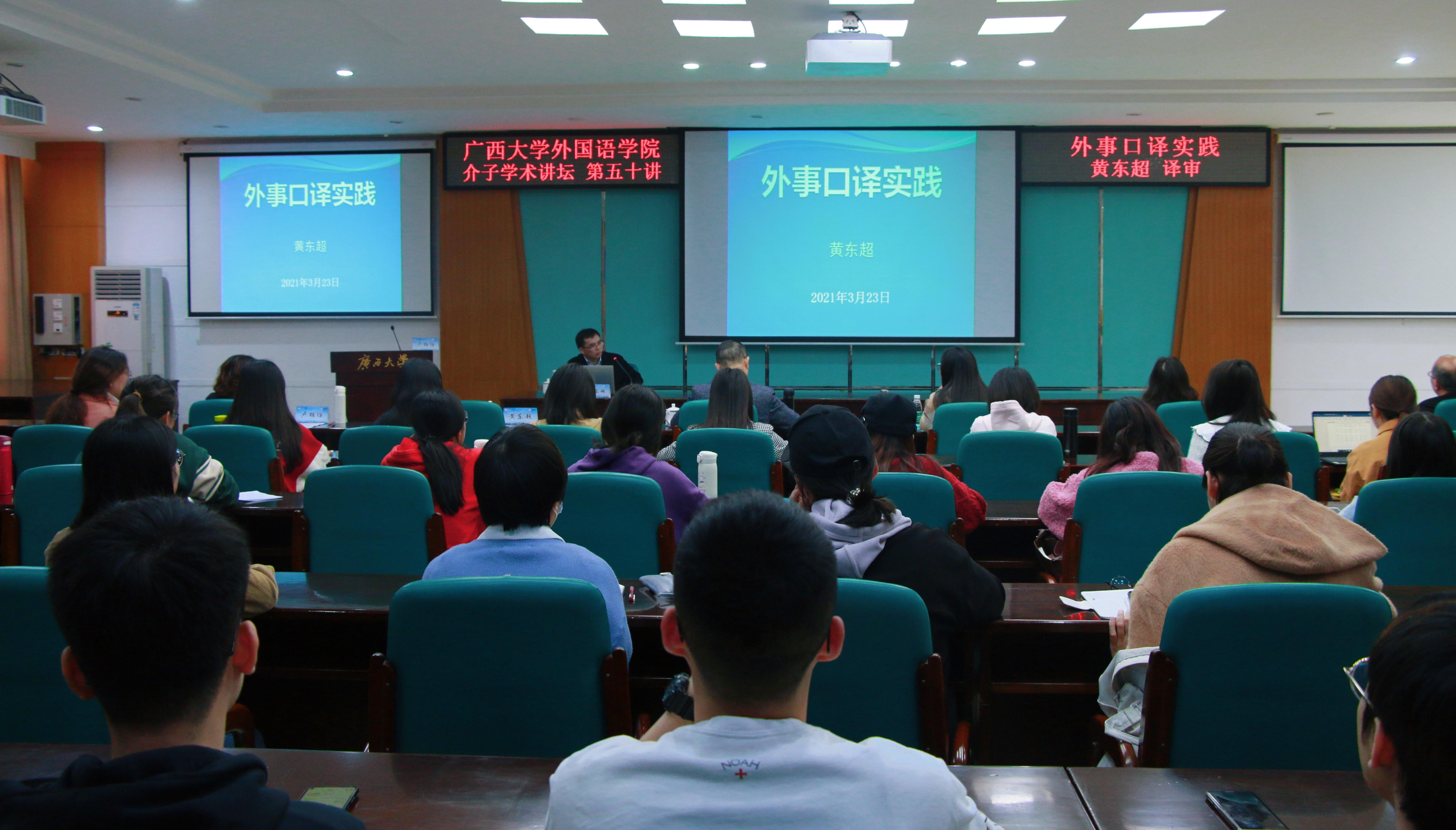 3月23日下午,外国语学院介子学术论坛第五十讲在广西大学君武馆第二会议室成功举办。广西广播电视台北部湾之声监制、译审黄东超老师莅临我校,为我院越南语专业师生带来了题为《外事口译实践》的精彩讲座,讲座由我院东南亚语系副主任卢锦缨老师主持。
