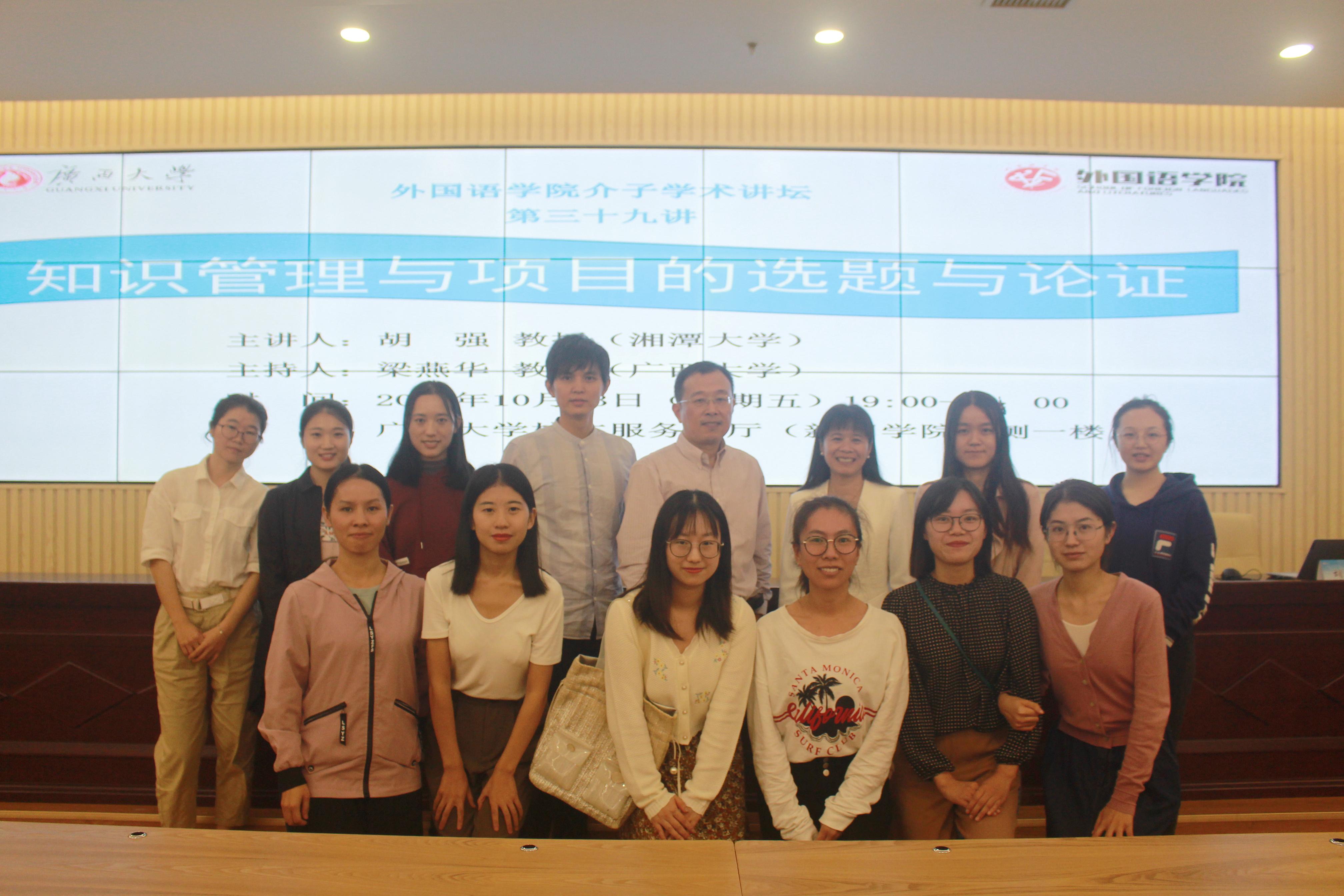 10月23日晚,外国语学院介子学术讲坛第三十九讲于广西大学校友服务大厅顺利举行。湘潭大学外国语学院院长、湖南省高校学科带头人、“英语”国家级一流专业建设点负责人胡强教授,应邀为我院师生带来了题为“知识管理与项目的选题与论证”的精彩讲座。本次讲座由外国语学院梁燕华教授主持。