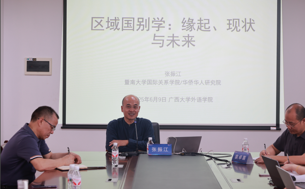 6月9日下午,外国语学院介子学术讲坛第九十四讲在学院301会议室举行。暨南大学张振江教授应邀做题为“区域国别学:缘起、现状与未来”的讲座。讲座由袁卓喜教授主持。