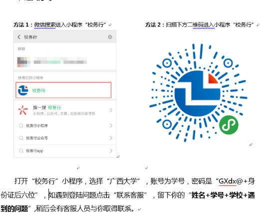 微信添加“校务行”小程序,选择“广西大学”,账号为学号,密码为GXdx@+身份证后六位,可根据自身需求下载并打印电子在校证明、电子成绩单(无需到教学办盖章,自行彩打即可)。