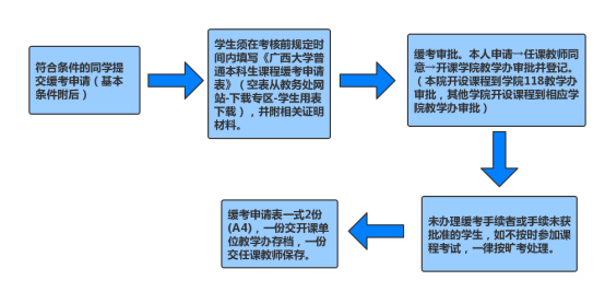因病因伤等突发性紧急情况导致无法到场完成考核的,如确实无法考前办结,必须通过电话等形式事先报告任课教师、班主任或学院教学办,并在考核结束后3天内备齐相关材料补办缓考申请手续。