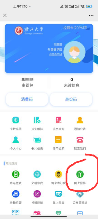 可持本人有效证件(身份证/学生证)到网络大楼一楼(计算机学院对面,绿色玻璃那一栋楼)自助补卡机办理补卡手续,补卡时需交纳卡片工本费20元。关于校园卡使用的其他问题,详见信息网络中心官网(https://net.gxu.edu.cn/info/1335/3085.htm)