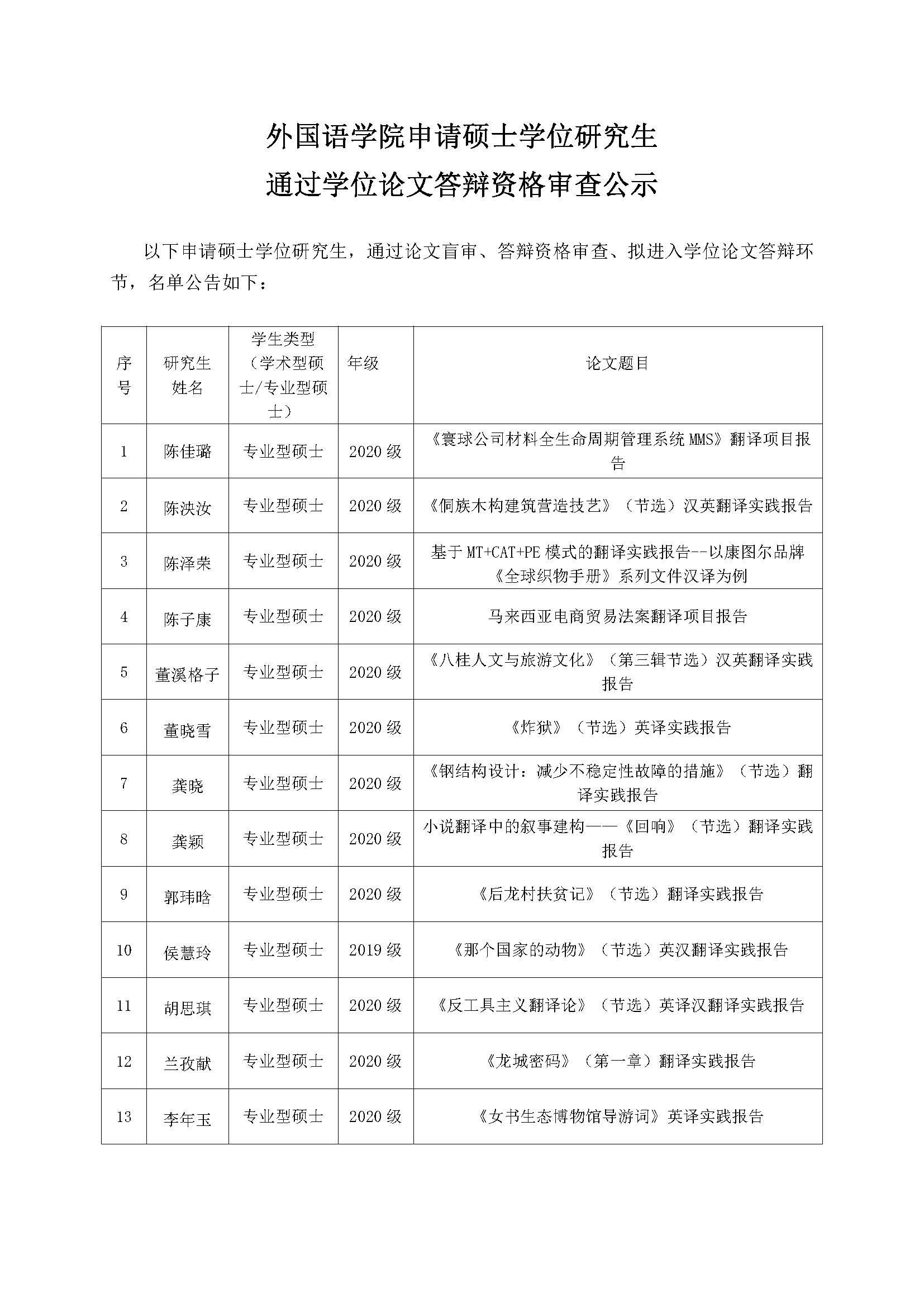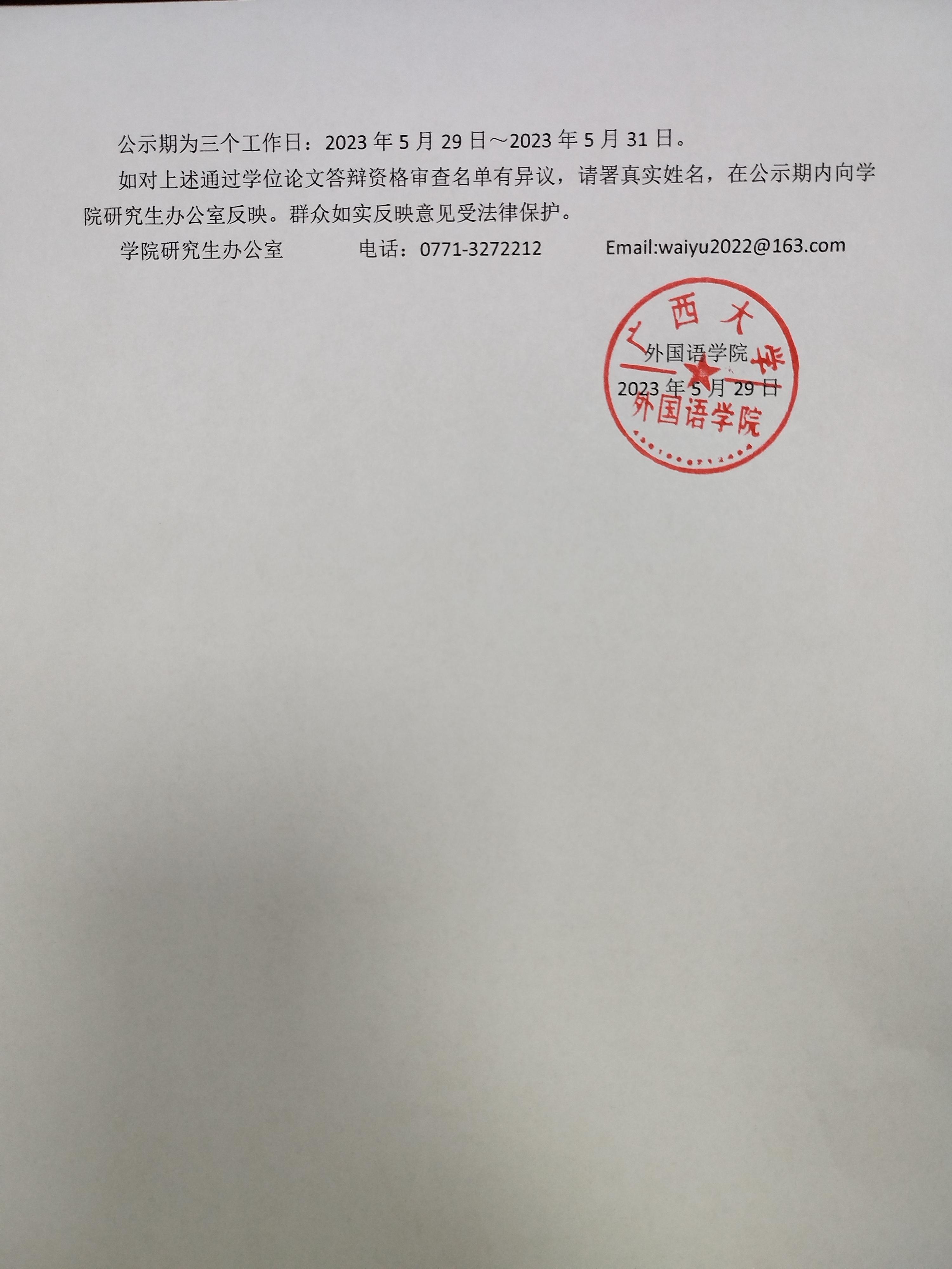 2023年外国语学院申请硕士学位研究生通过学位论文答辩资格审查公示