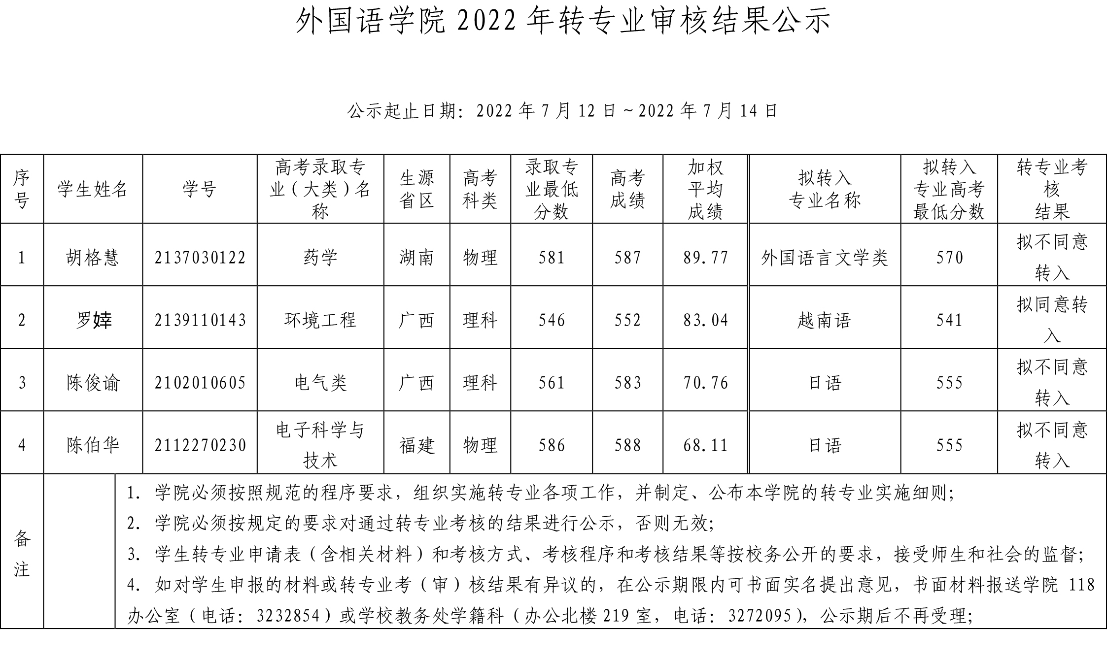 外国语学院2022年转专业审核结果公示