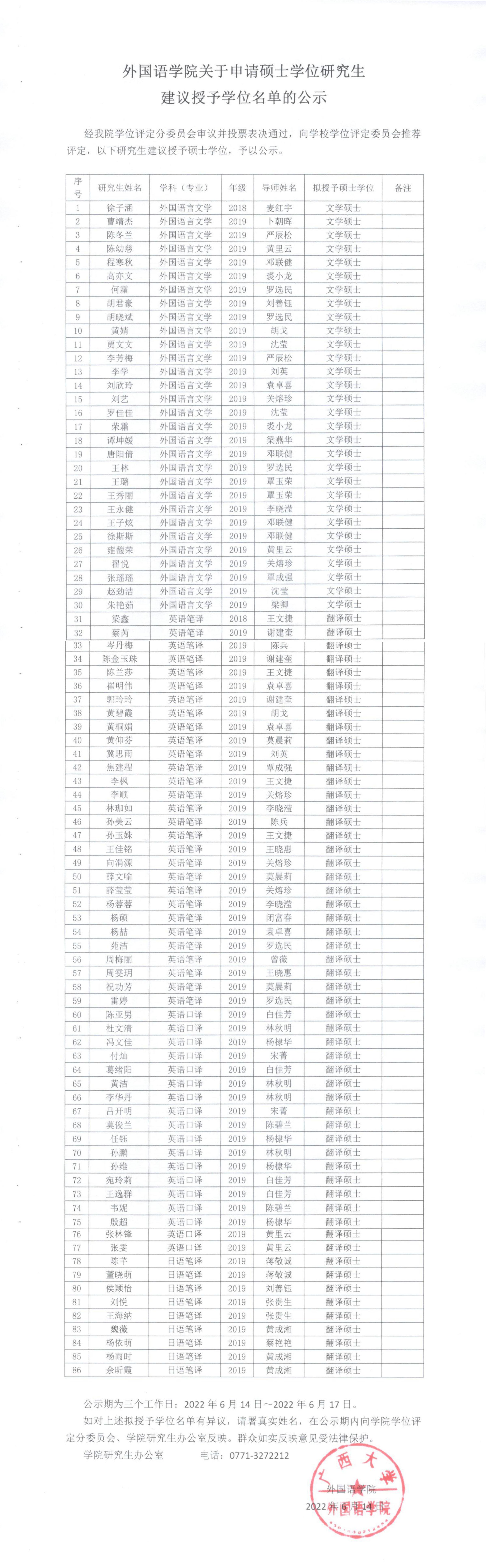 2022年外国语学院关于申请硕士学位研究生建议授予学位名单的公示