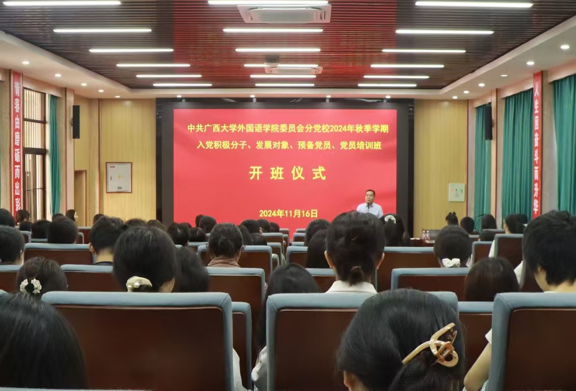 11月16日,中共广西大学外国语学院委员会分党校举行秋季学期培训班开班仪式,学院党委书记莫柏林和本期分党校入党积极分子、发展对象、预备党员培训班共137名学员参加开班仪式。开班仪式由学院党委副书记程锐主持。