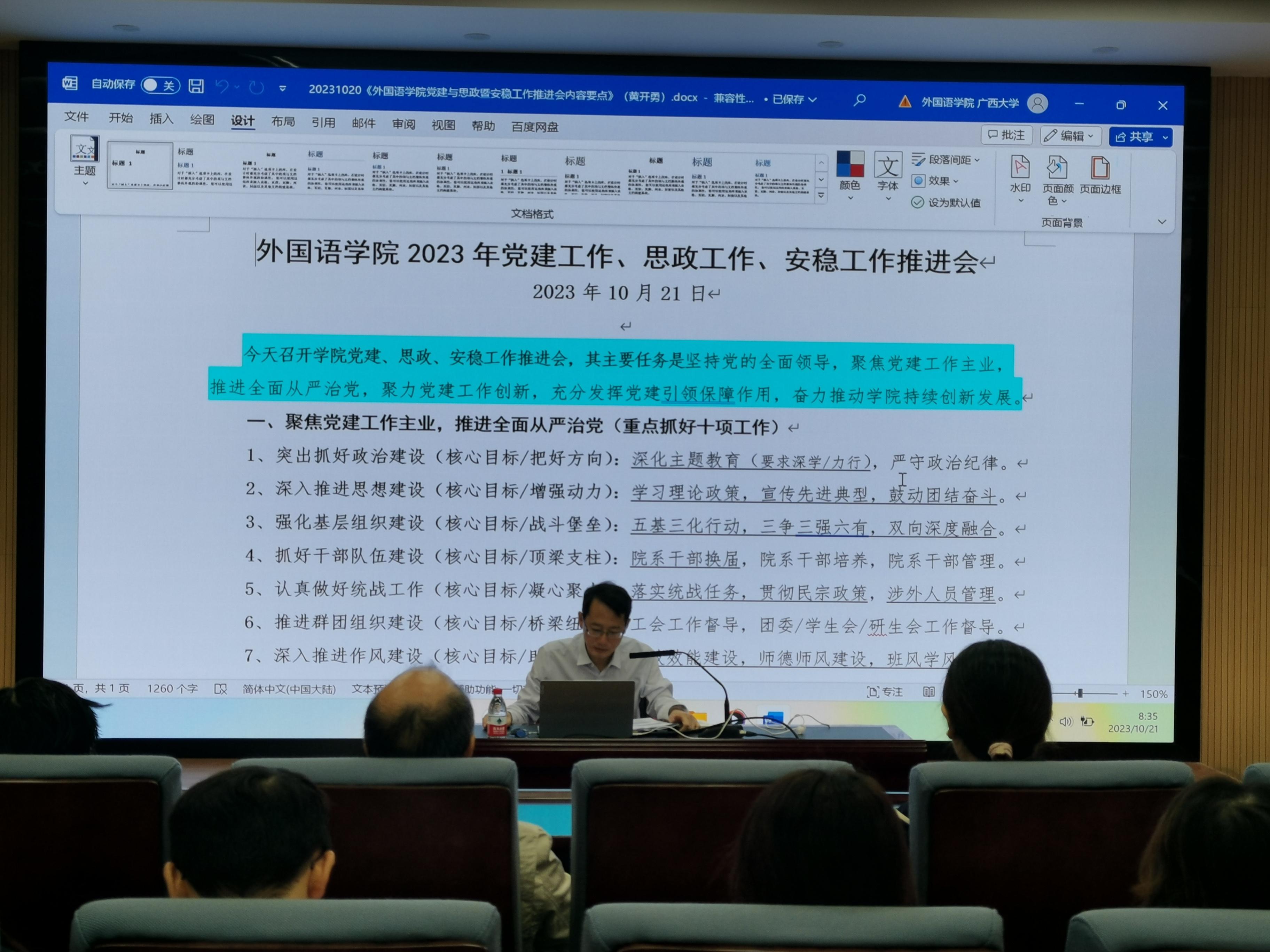 10月21日上午,外国语学院党委在学院融通报告厅召开2023年党建工作、思政工作、安稳工作推进会,主要任务是坚持党的全面领导,聚焦党建工作主业,深入推进全面从严治党,聚力党建工作创新,发挥党建引领保障作用,凝心聚力推动学院创新发展。