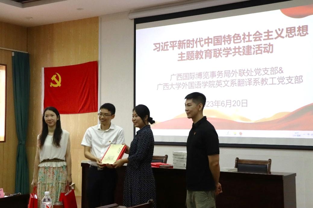 6月20日,广西大学外国语学院英文系翻译系教工党支部与广西国际博览事务局对外联络处党支部联合开展“习近平新时代中国特色社会主义思想”主题教育联学共建活动。广西国际博览事务局对外联络处处长肖潇、副处长黄炜,广西大学外国语学院党委副书记肖克宁,广西大学外国语学院副院长白佳芳等共计19人参加活动。