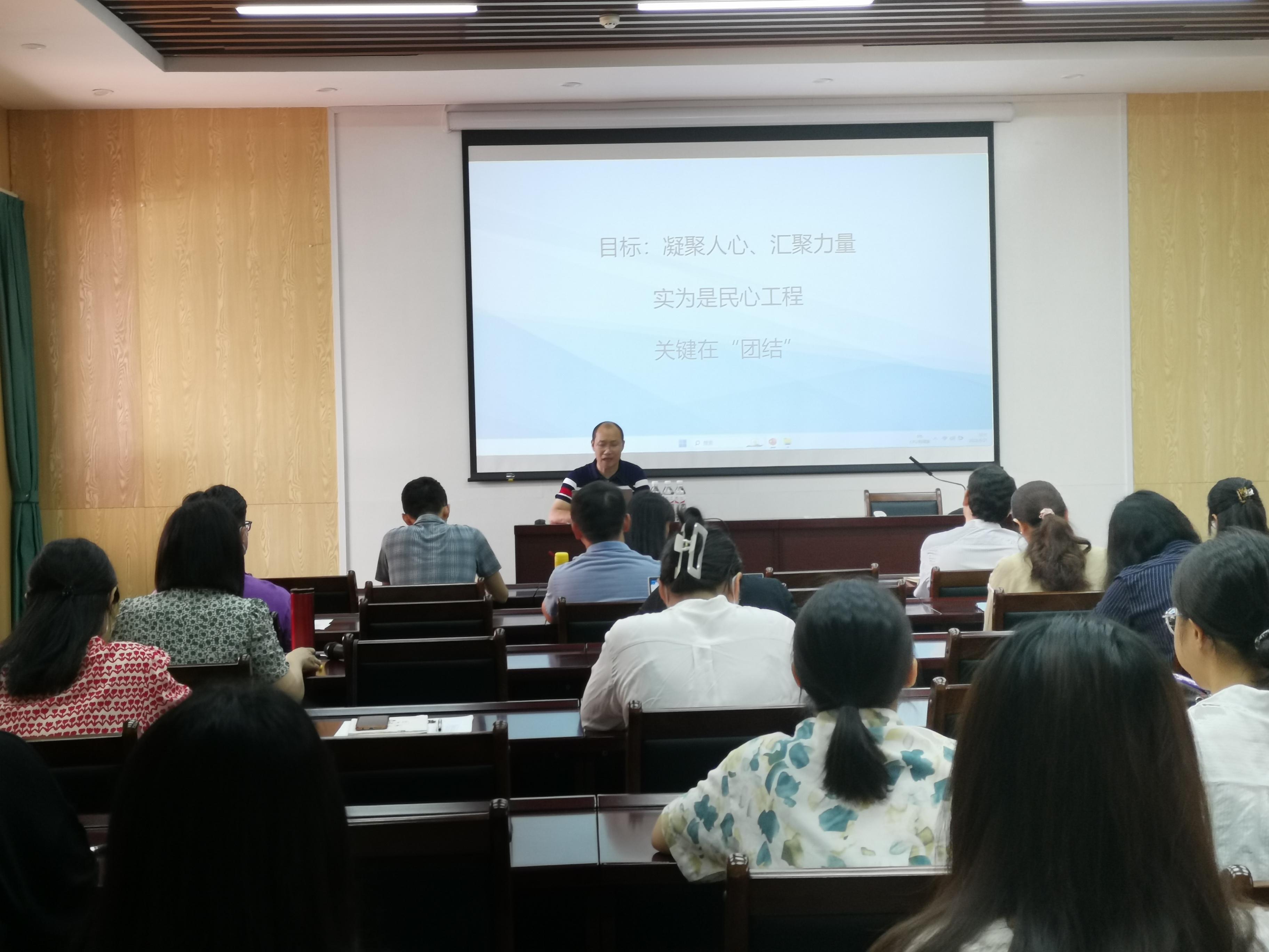 袁卓喜主讲党课题为《积极创新统一战线工作,汇聚学院创新发展力量》,内容包括调研基本情况、调查研究反馈问题、问题原因分析、新时代我院统战工作的新思考等。他指出,统战工作的目标是凝聚人心、汇聚力量,实为民心工程,关键在“团结”,要努力营造党内外知识分子大团结、大融合的学术氛围,共同为科技强桂和壮美广西建设贡献西大力量。