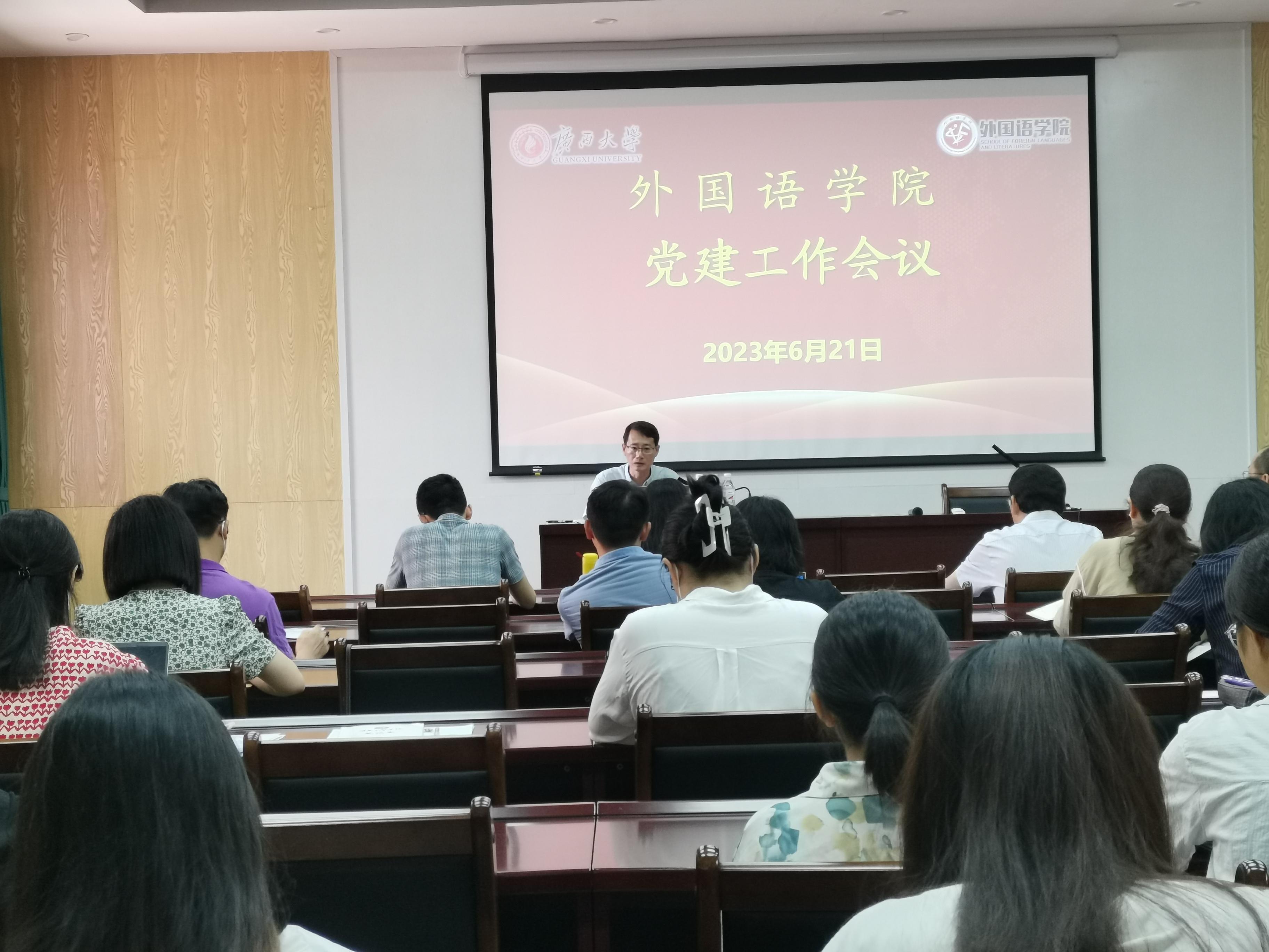 6月21日上午,外国语学院党委在学院践行报告厅举办学习贯彻习近平新时代中国特色社会主义思想主题教育专题党课。学院党委副书记肖克宁、学院党委委员袁卓喜、蒋敬诚在学习调研基础上讲专题党课,学院全体党务干部参加党课。
