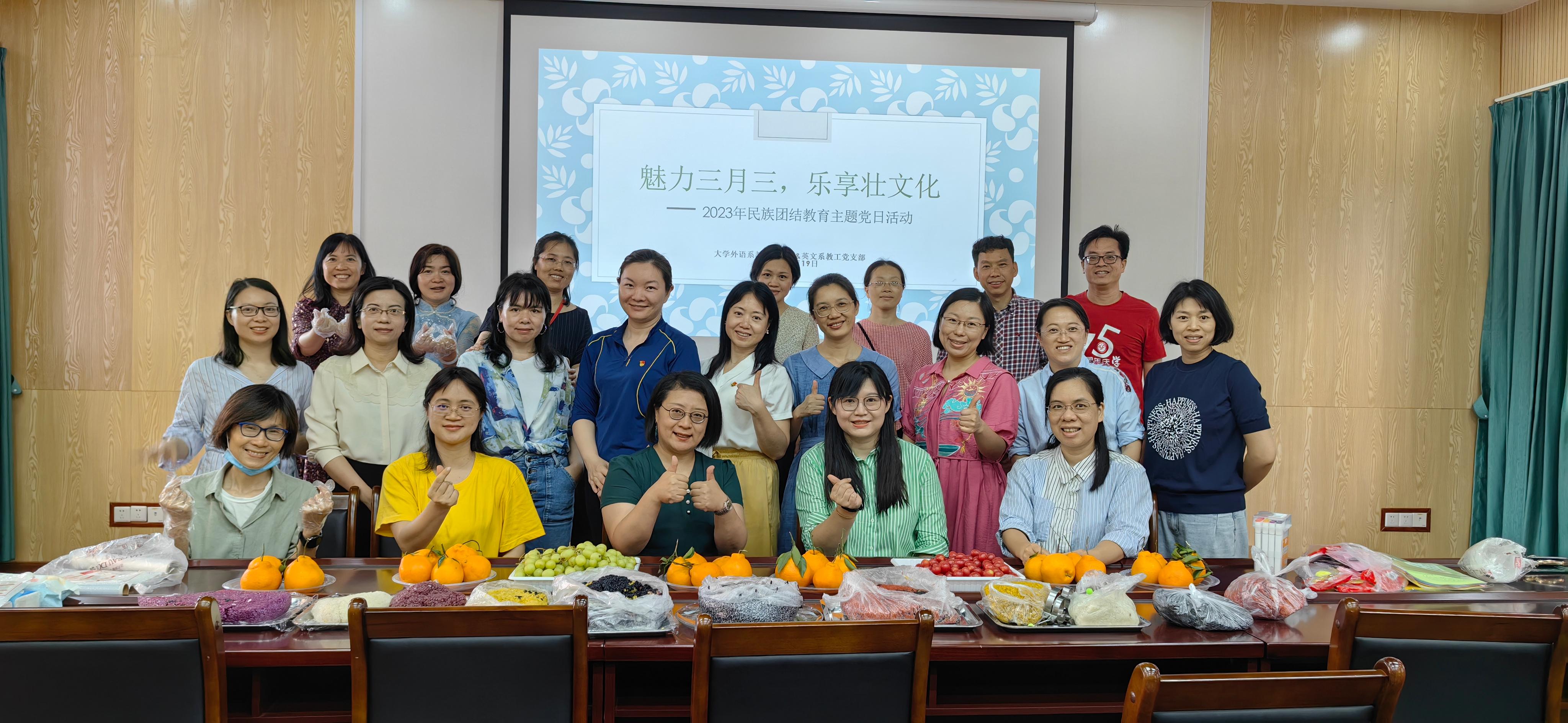 英文系翻译系教工党支部与大学外语系教工党支部在学院践行厅联合开展“魅力三月三,乐享壮文化”活动。两个支部的教师党员相互交流,通力协作,进行了山歌对唱、制作绣球和铜鼓摆件等民族特色手工艺品以及五色糯米饭拼盘等。