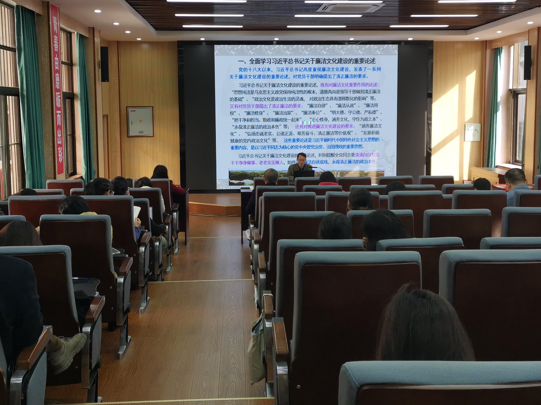 12月6日下午,外国语学院党委在学院融通报告厅举办廉洁文化建设专题讲座。本次讲座由学院党委书记黄开勇主讲,全体教工党员参加讲座。