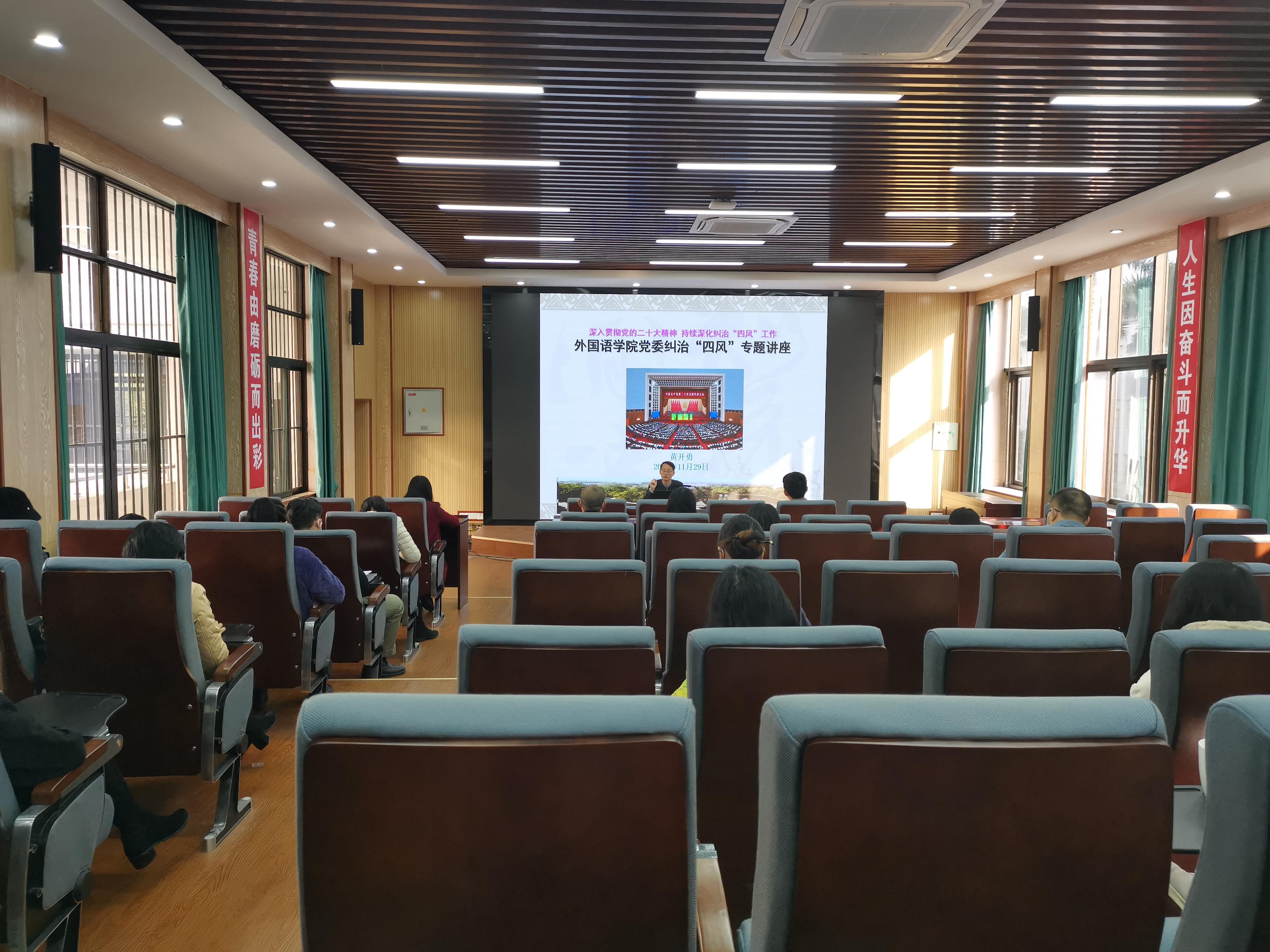11月29日下午,外国语学院党委在学院融通报告厅举办纠治“四风”专题讲座。本次讲座由学院党委书记黄开勇主讲,全体教工党员参加讲座。