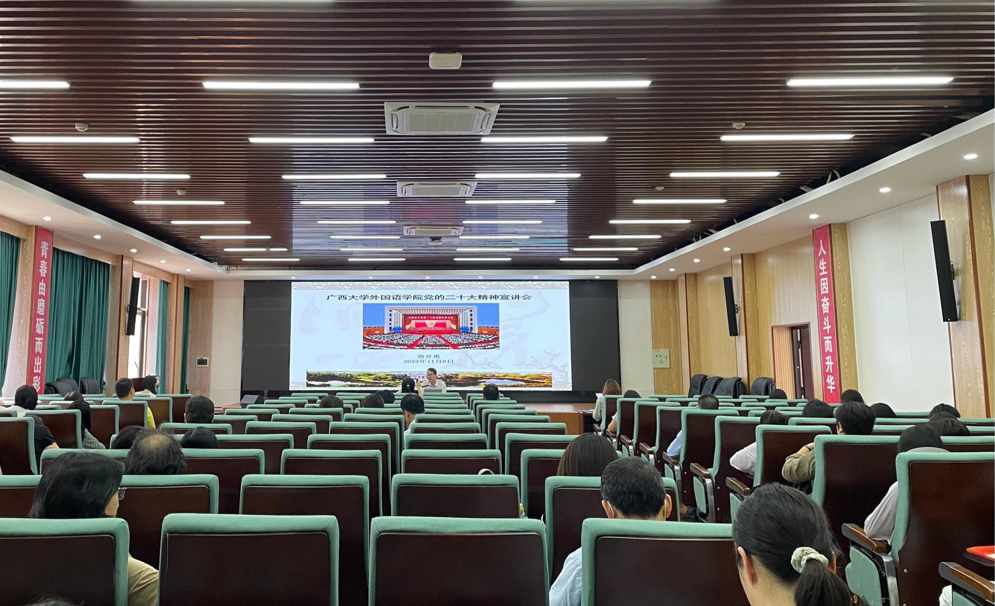 11月8日下午,外国语学院党委在学院求是报告厅召开党的二十大精神宣讲会。宣讲会由学院党委书记黄开勇主讲,全体教师参加宣讲会。