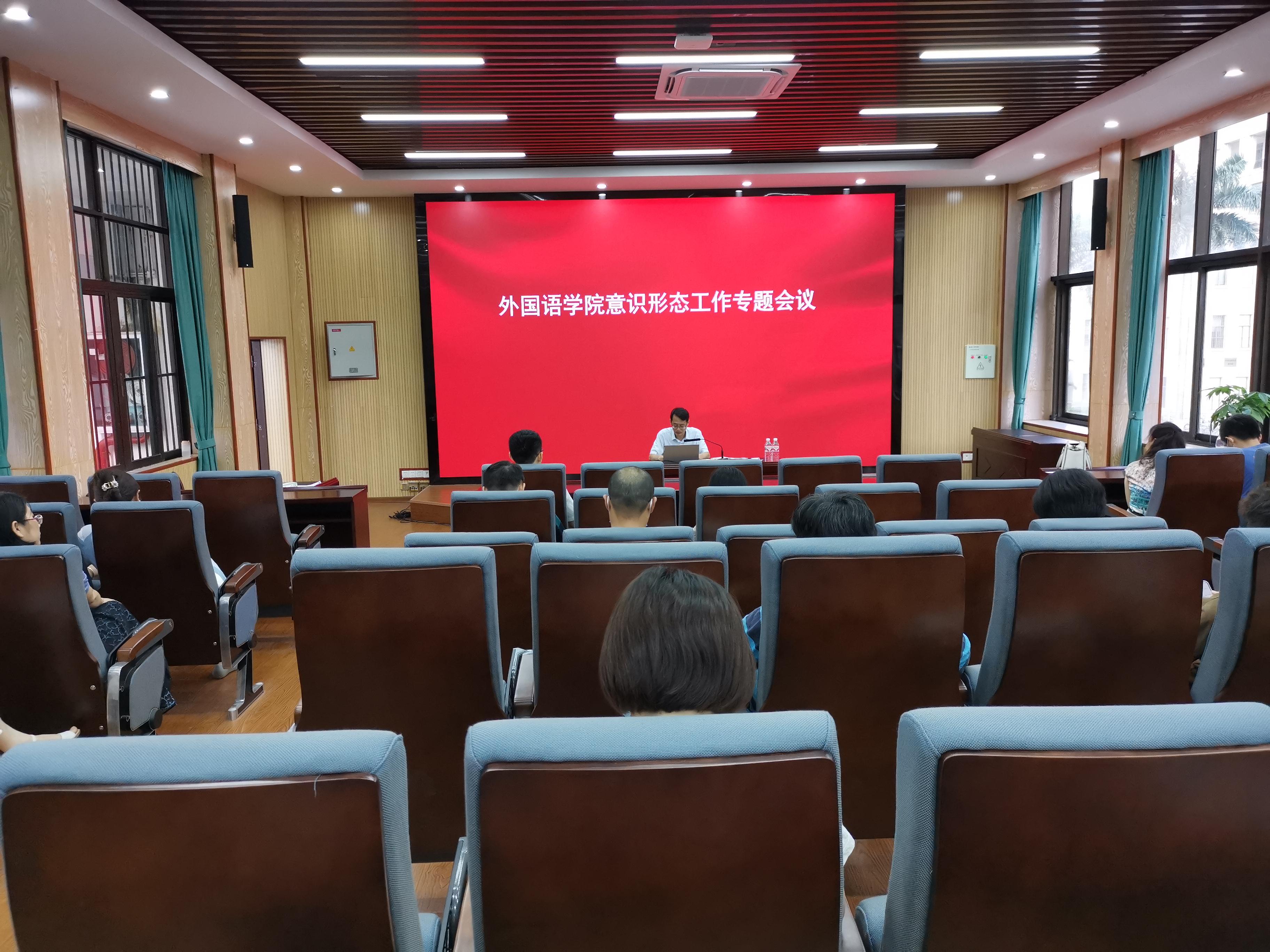 6月21日下午,外国语学院党委在学院融通报告厅召开意识形态工作专题会议,专题研究和具体部署2022年学院意识形态工作。学院党委书记黄开勇作部署讲话,学院全体党委委员、支部委员、各系干部等参加会议。
