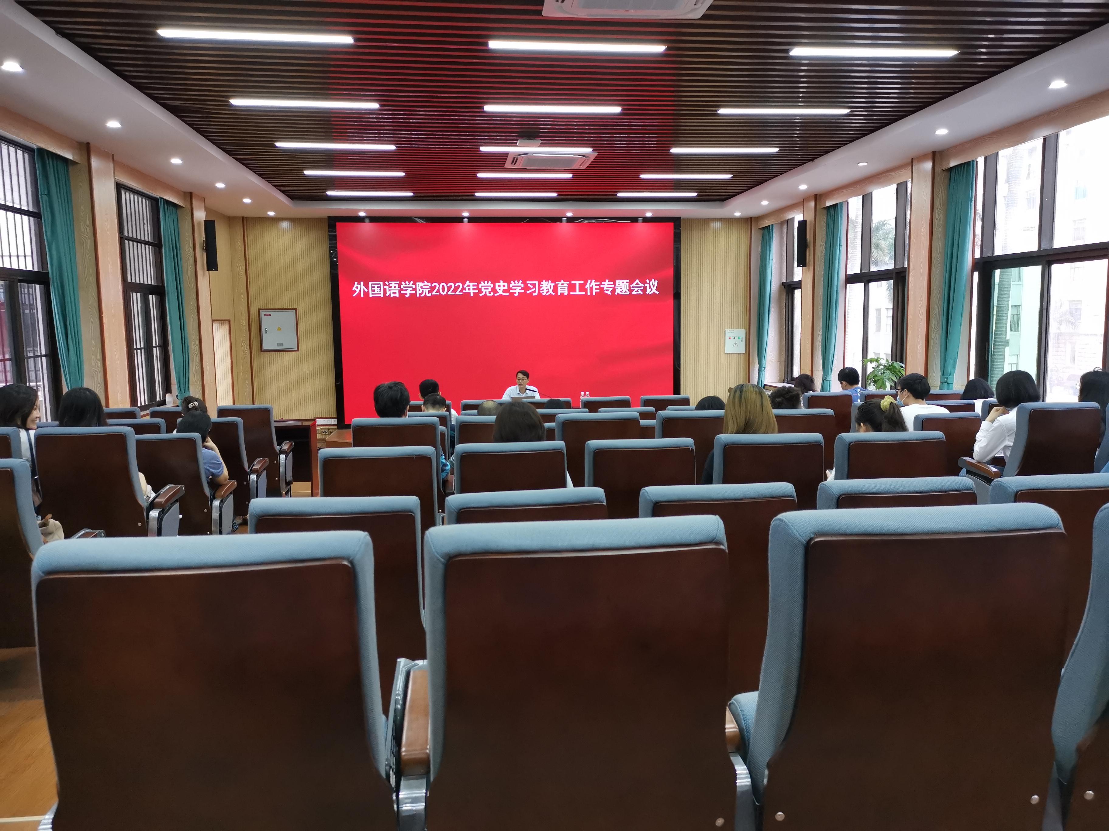 6月21日下午,外国语学院党委在学院融通报告厅组织召开党史学习教育工作专题会议,总结学院2021年党史学习教育工作,部署2022年学院党史学习教育工作。学院党委书记黄开勇主持会议并发表讲话,学院全体党委委员、支部委员、各系干部等参加会议。。